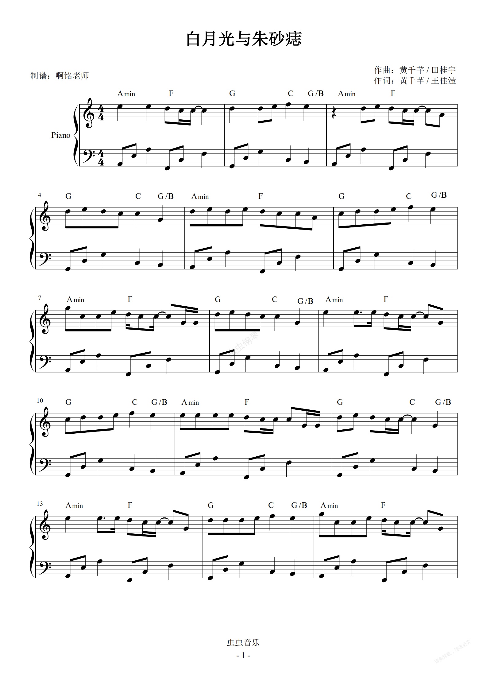 钢琴谱:白月光与朱砂痣 C调简易 拜厄难度