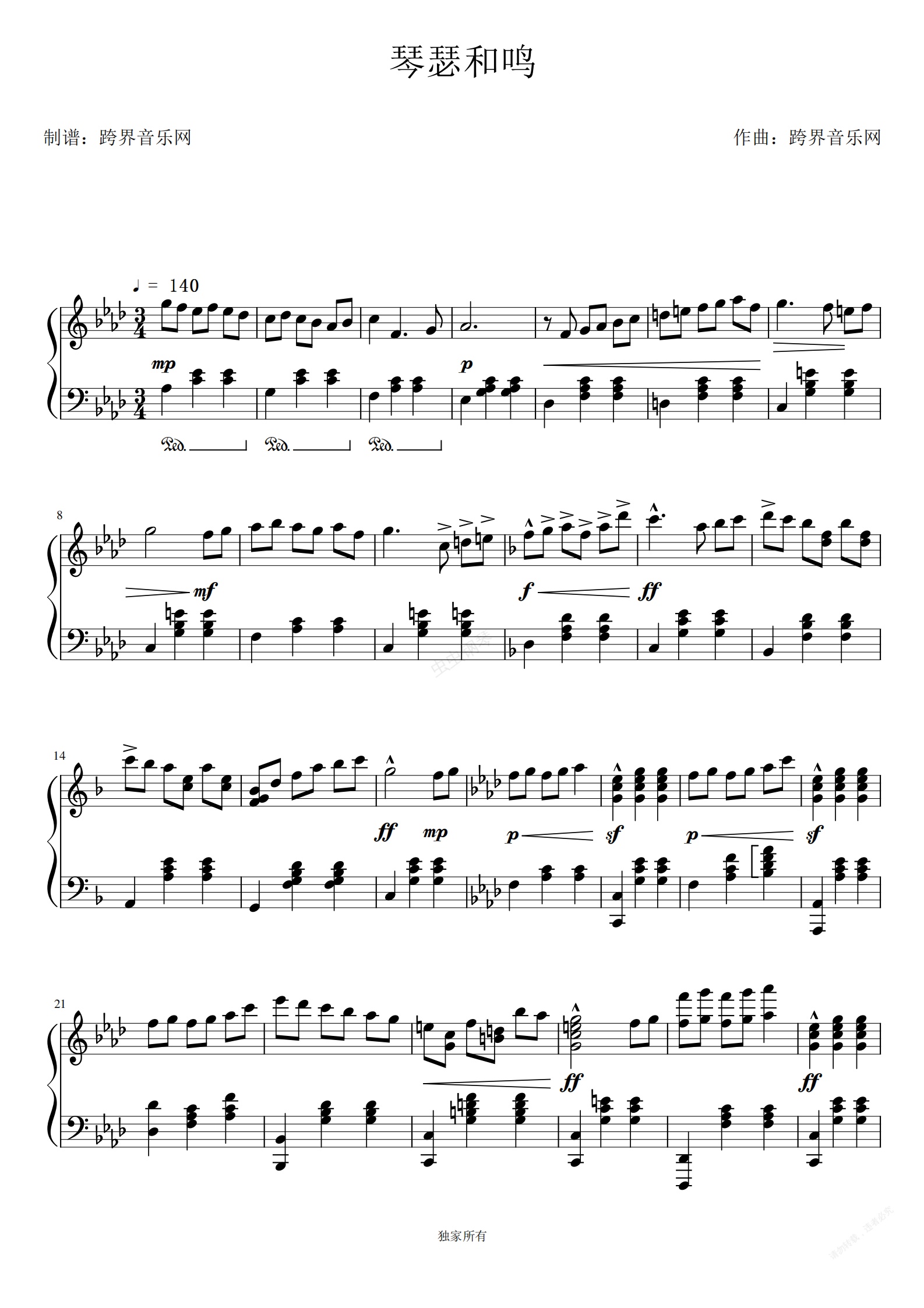 初来乍到,不敢糊弄大家,精心送上一首原创钢琴小品,稍微有一点难度但篇幅不长,希望大家能听到最后,因为最后的10个小节能让您感觉到我的不同!试听资源是打谱软件自带的MP3音效,自弹效果极佳。希望大家多多支持!!!