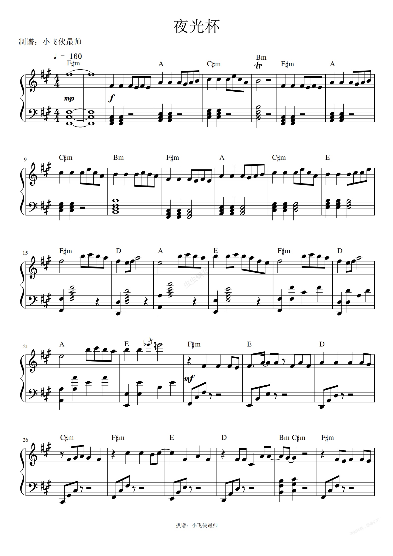 钢琴谱:夜光杯(含和弦)-2021拜年纪金曲