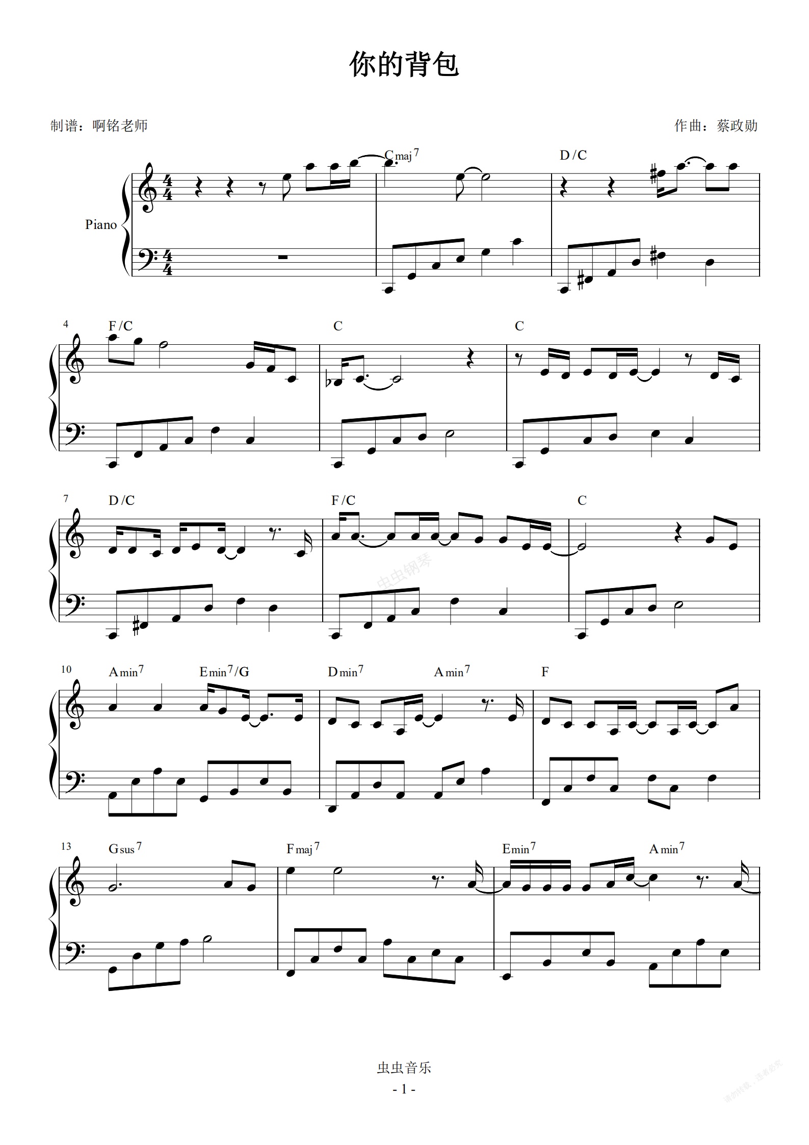 钢琴谱:你的背包 C调简易 原曲和弦