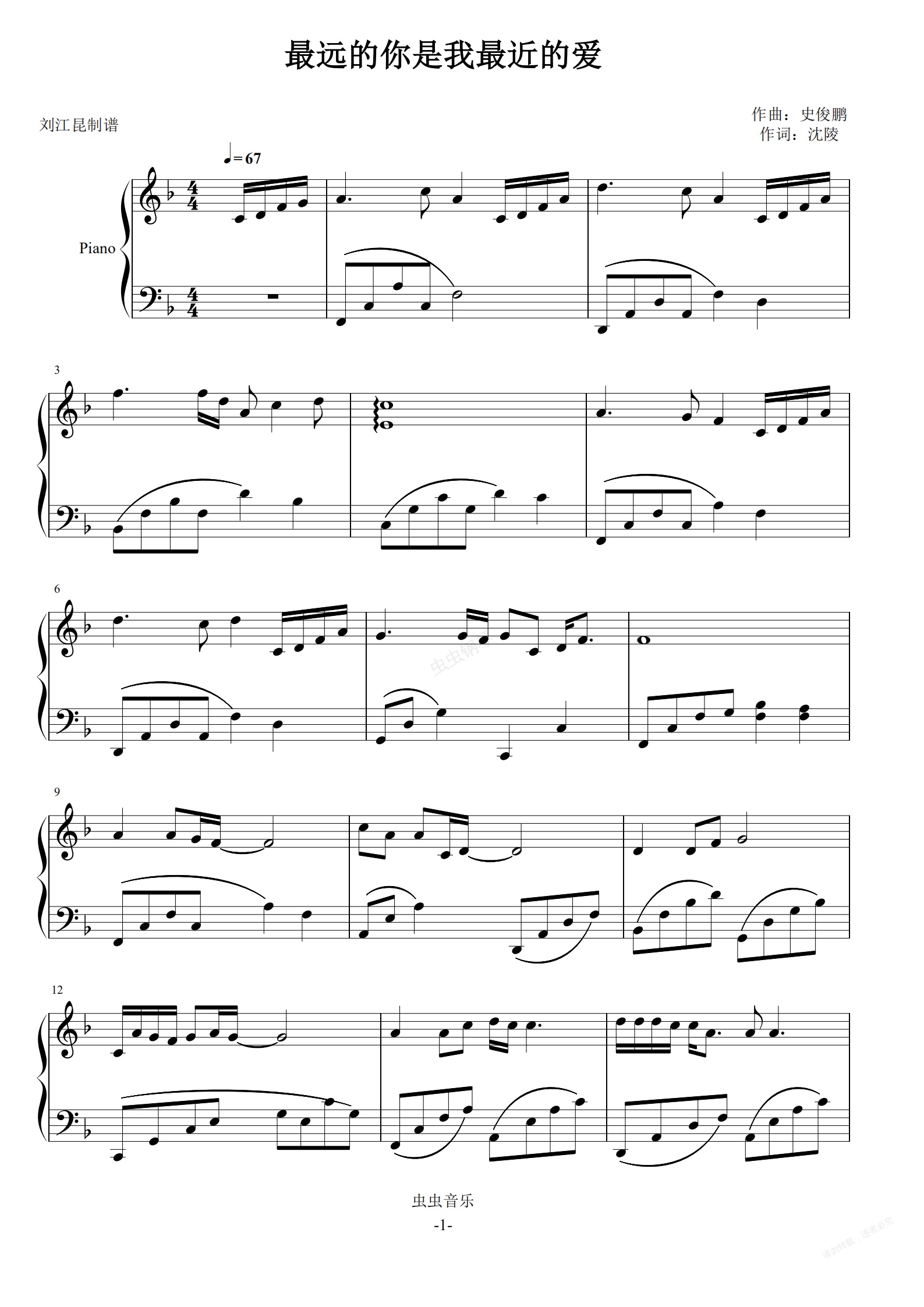 钢琴谱:最远的你是我最近的爱(原调抒情版)