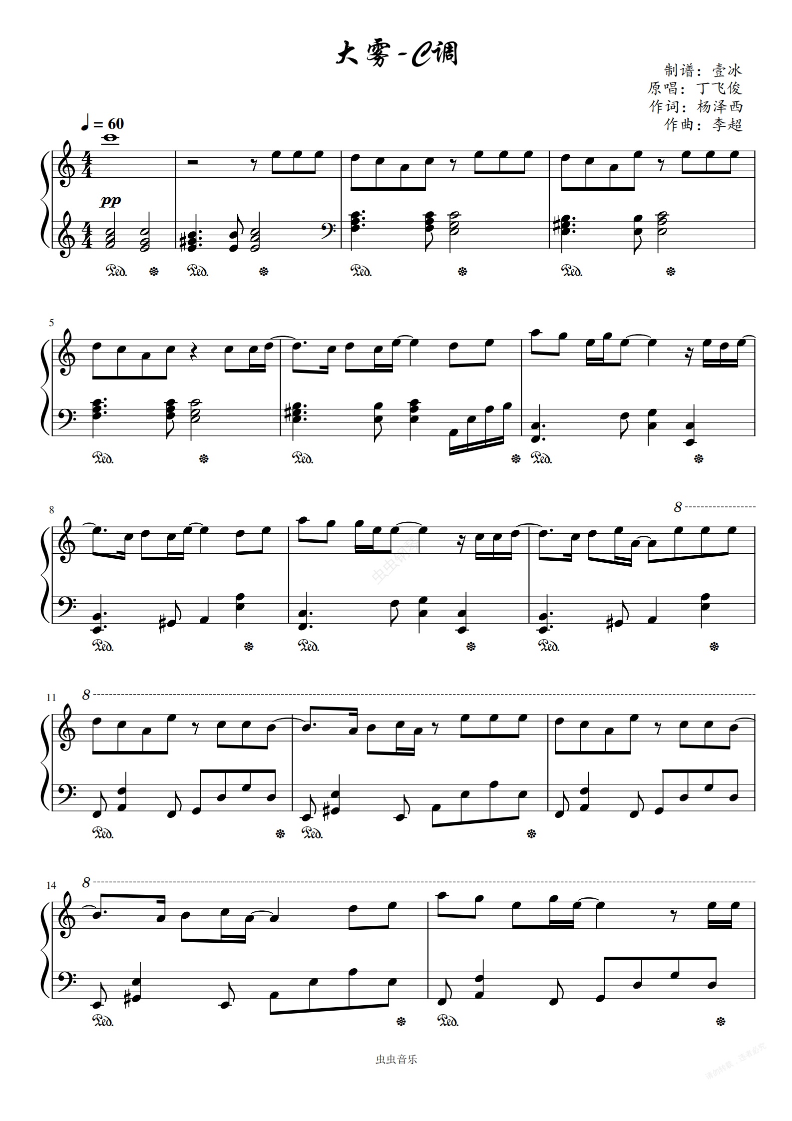 钢琴谱:大雾//丁飞俊-C调简单易上手