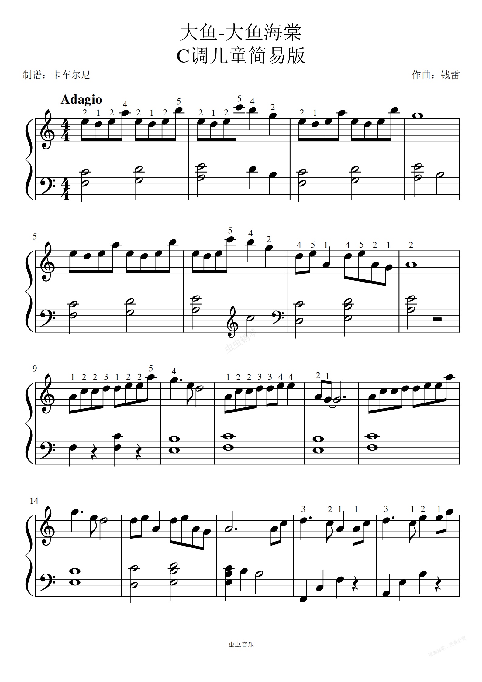 钢琴谱:周深-大鱼 C大调儿童简易版 带指法 考级一级难度