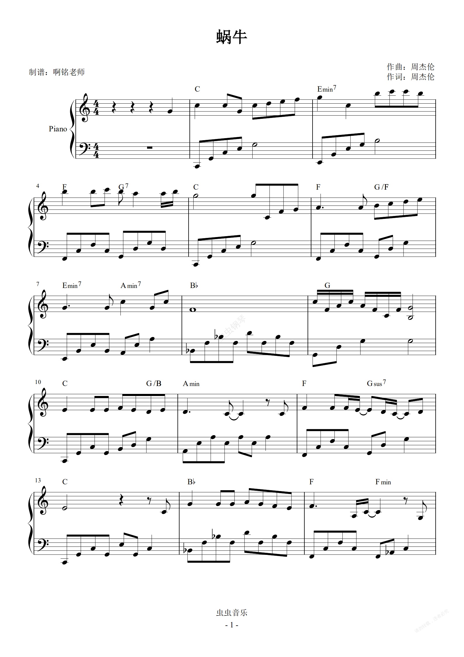 钢琴谱:蜗牛 G调简易 原曲和弦