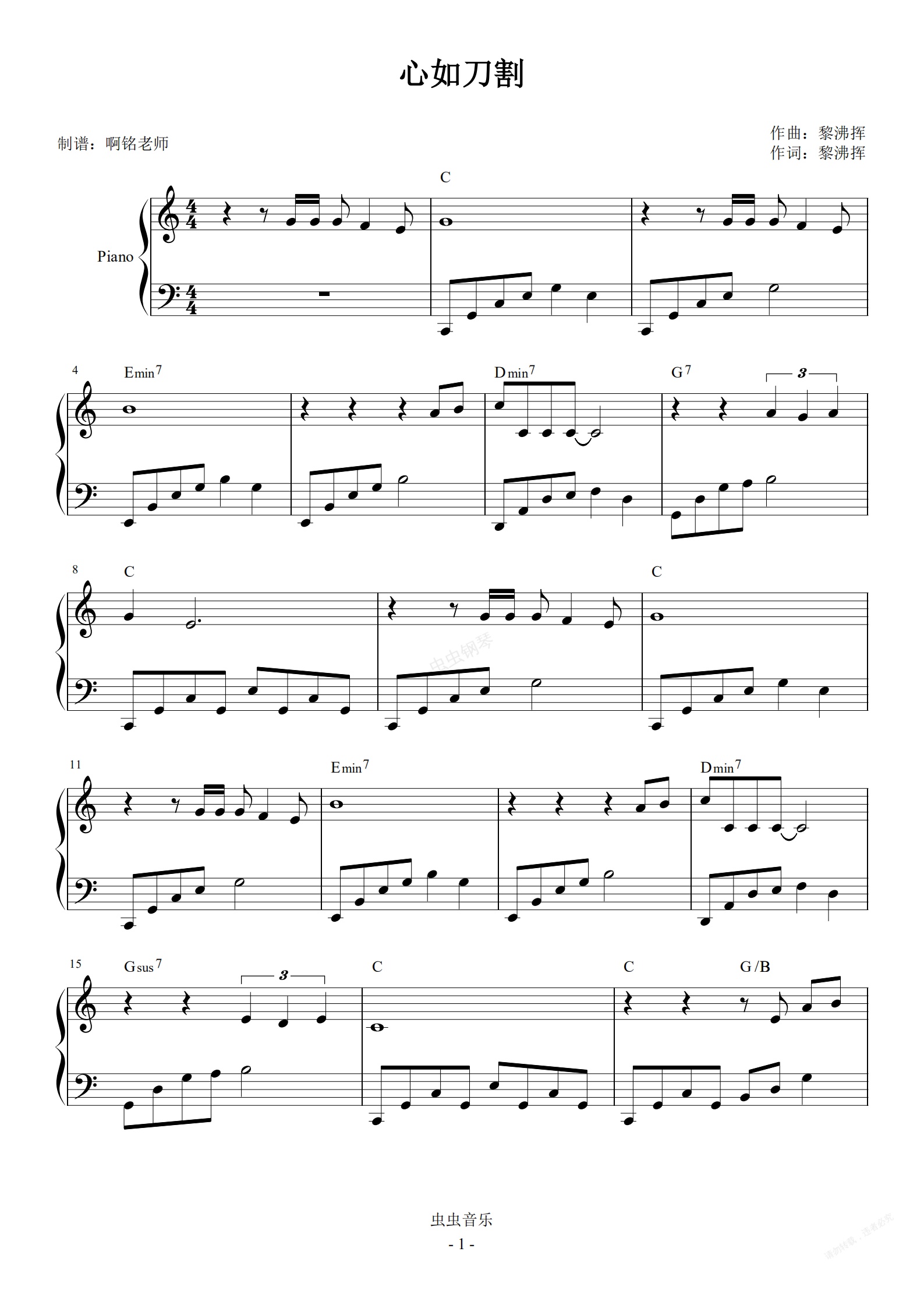 钢琴谱:心如刀割 C调简易 怀旧经典