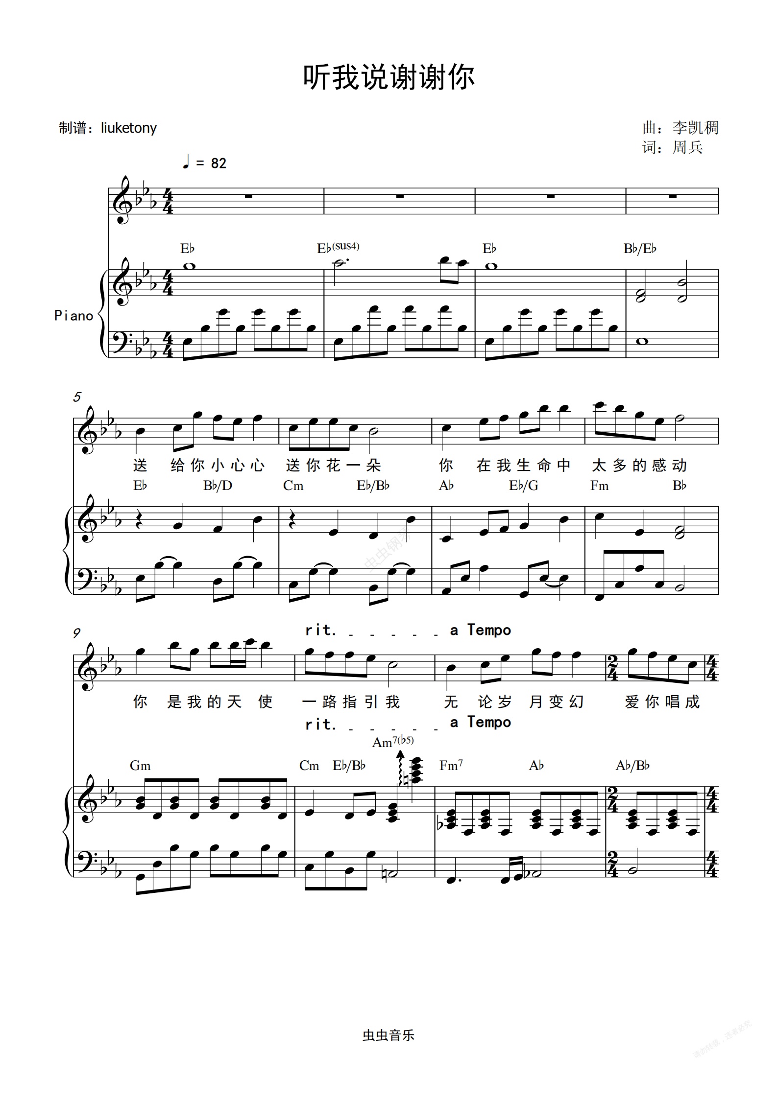 钢琴谱:听我说谢谢你 - 钢琴伴奏版 原调