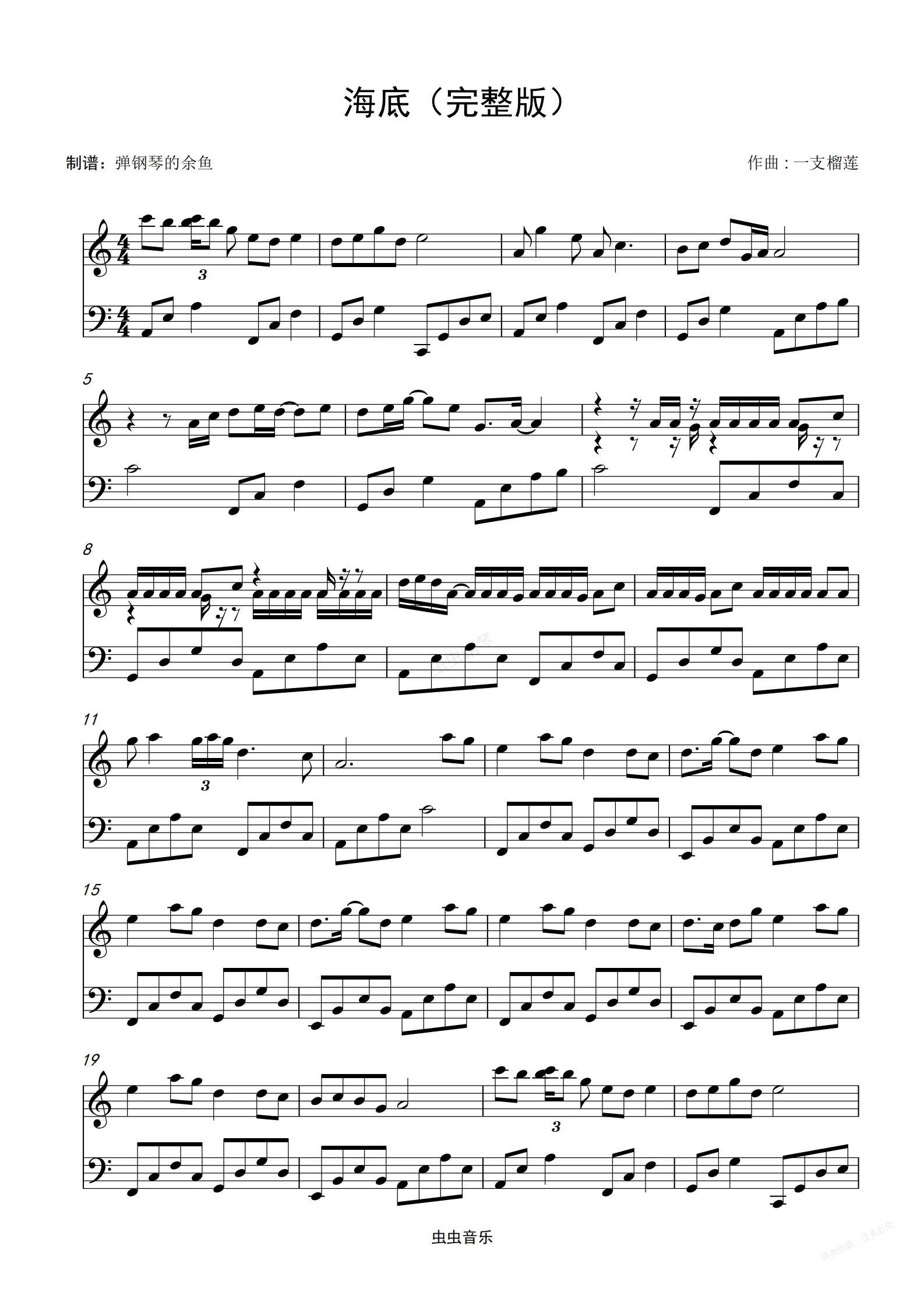 钢琴谱:海底-完整版-C调新手好听易学-弹钢琴的余鱼编配-抖音热歌
