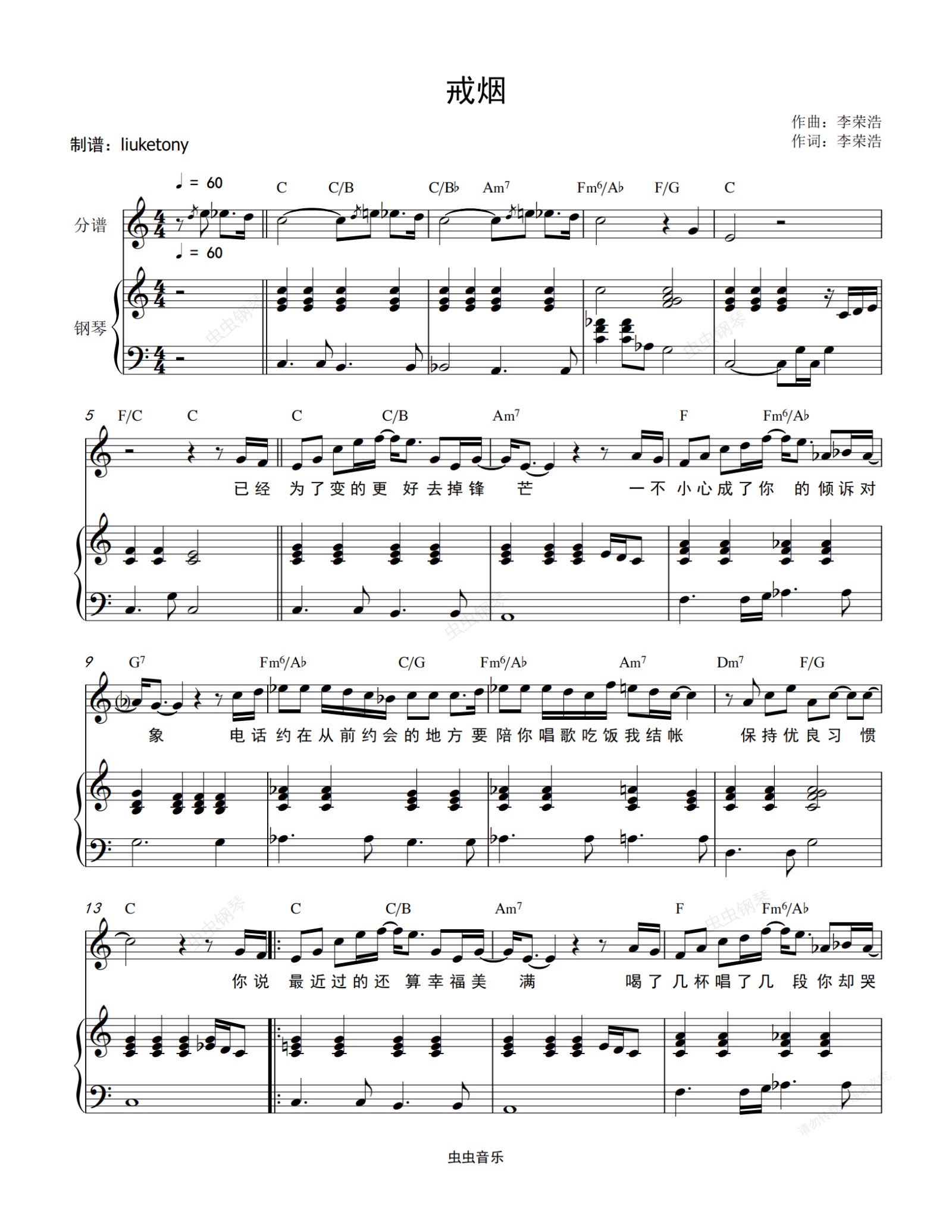 钢琴谱:戒烟 - 李荣浩(钢琴伴奏谱)原调