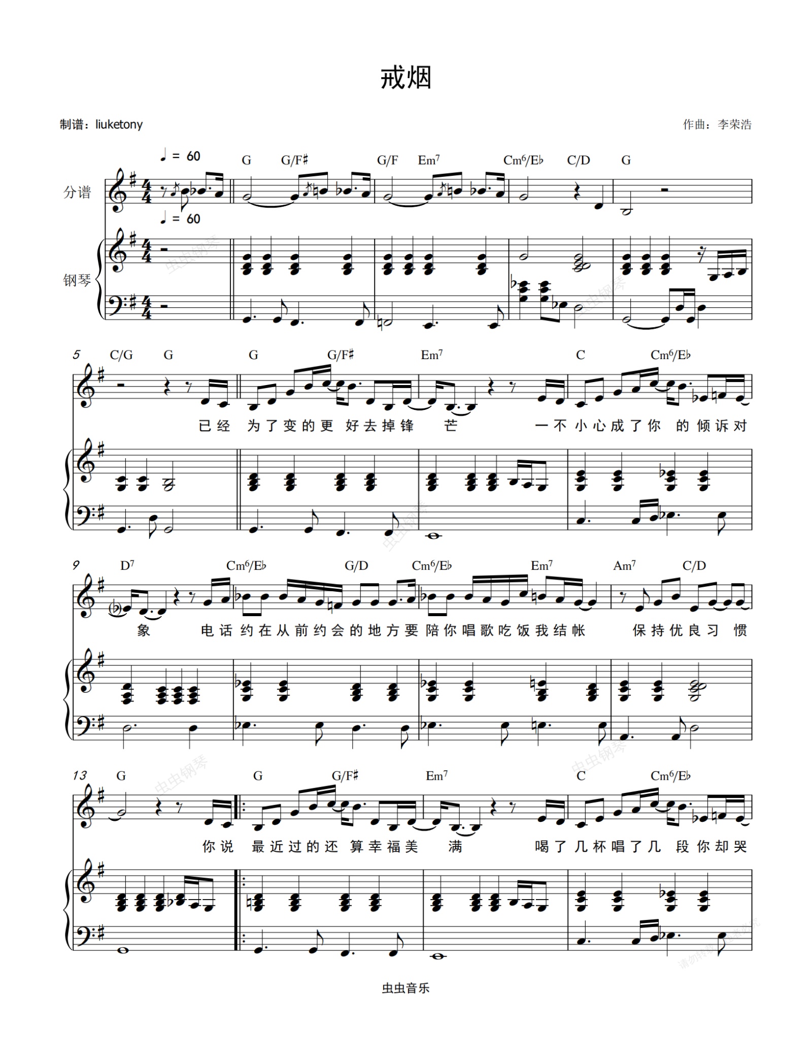钢琴谱:戒烟 - 李荣浩(钢琴伴奏谱)G调