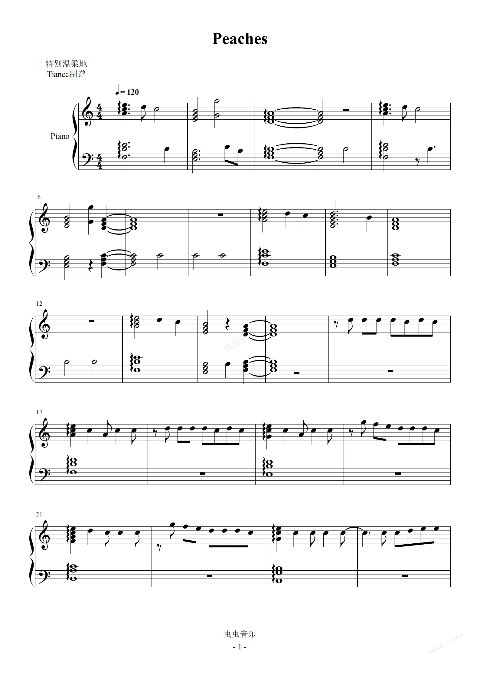 钢琴谱:《Peaches》贾斯丁比伯,柔情简单版,拜厄+难度