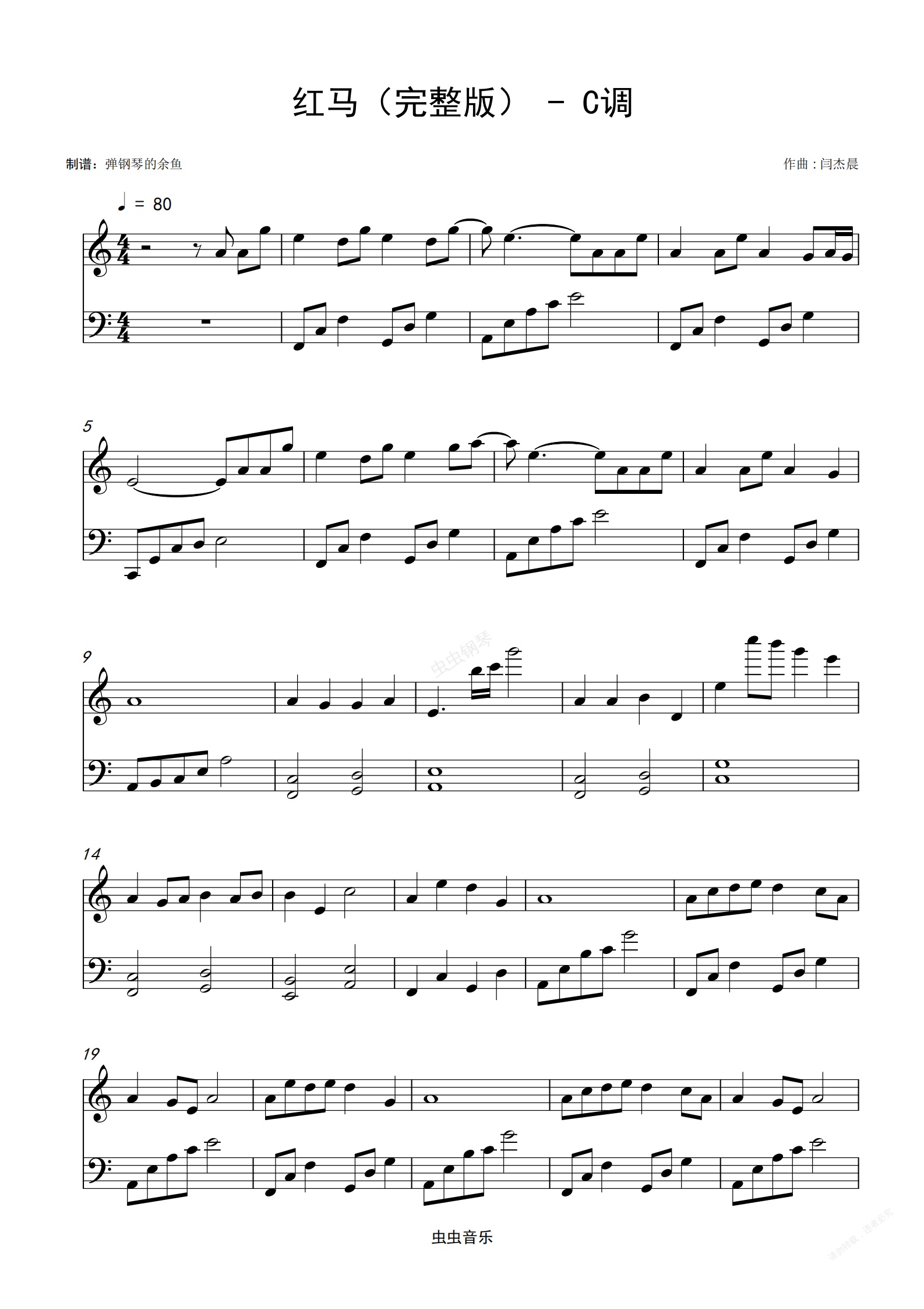 钢琴谱:《红马》新手好听易学还原版-C调-抖音热歌-弹钢琴的余鱼编配
