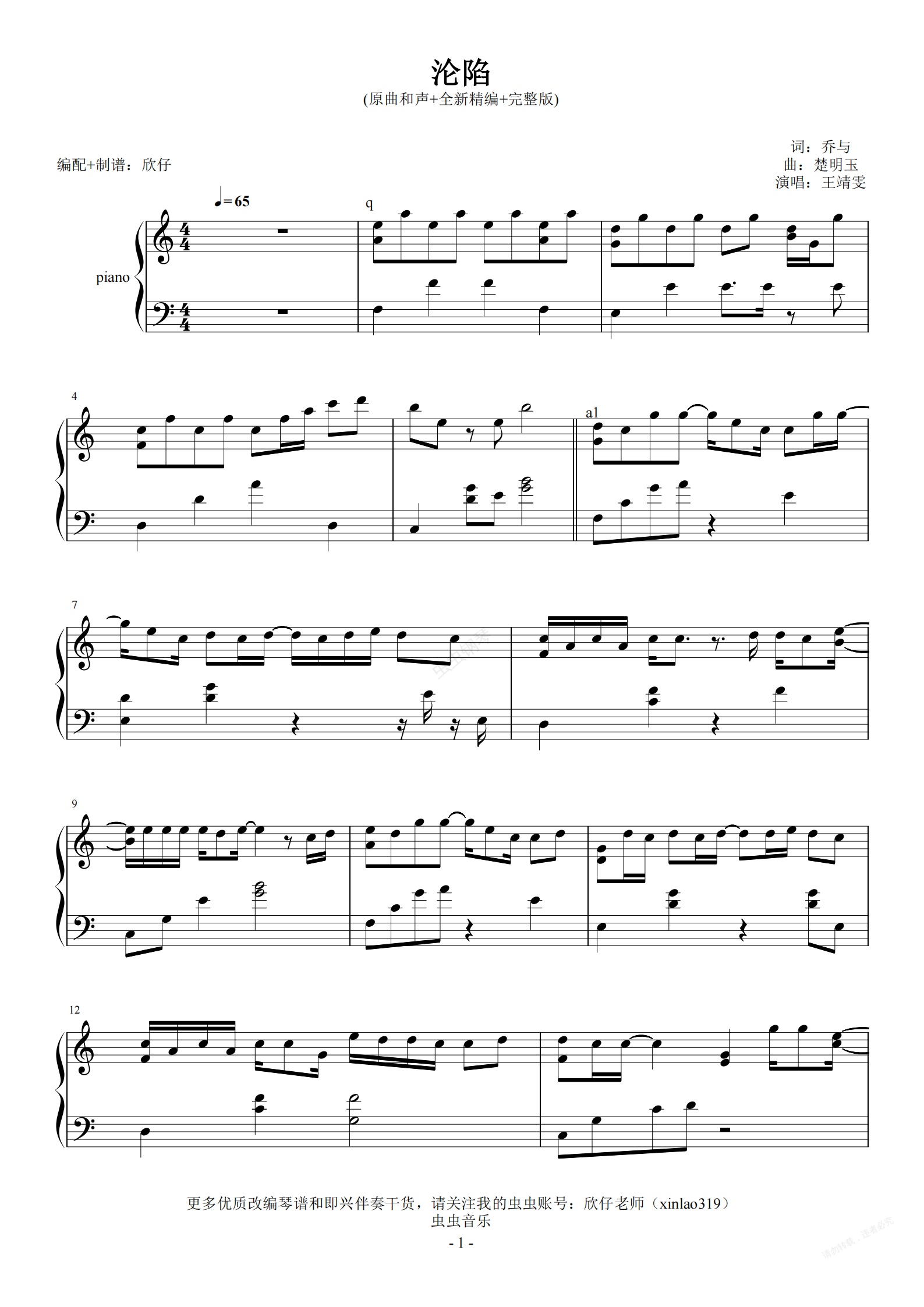 钢琴谱:王靖雯-C《沦陷》(原曲和声+全新精编+完整版)
