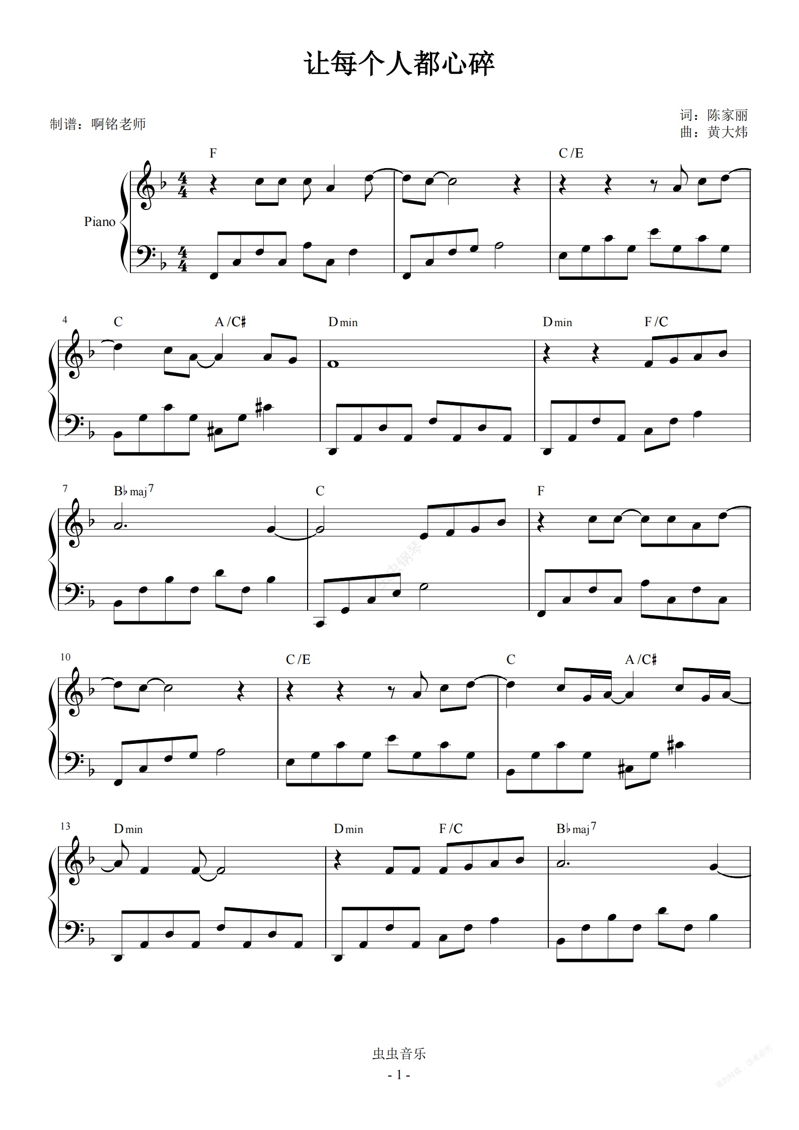 钢琴谱:让每个人都心碎【简易 怀旧】