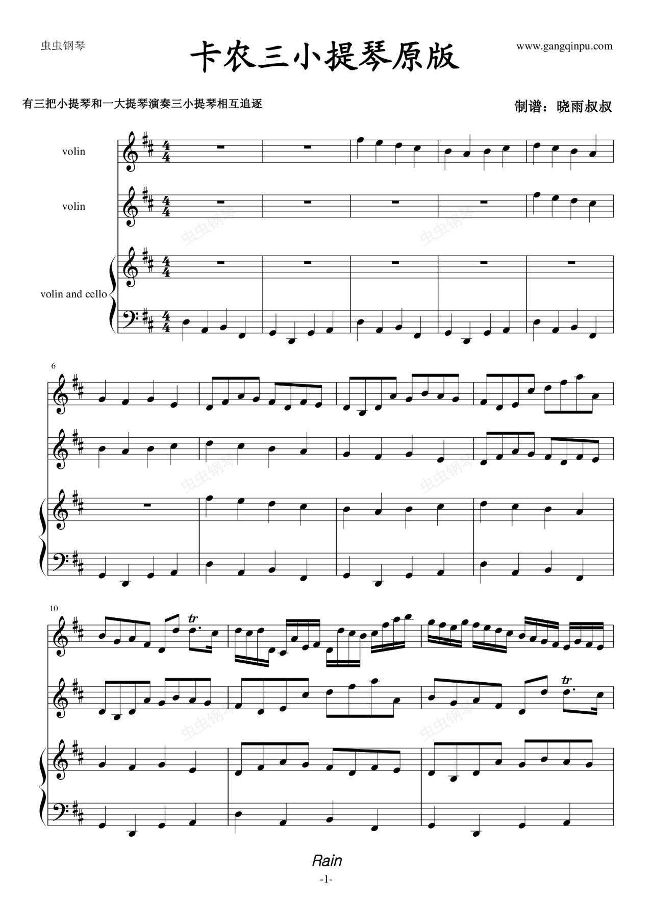 钢琴谱:卡农原版(三小提琴一大提琴)