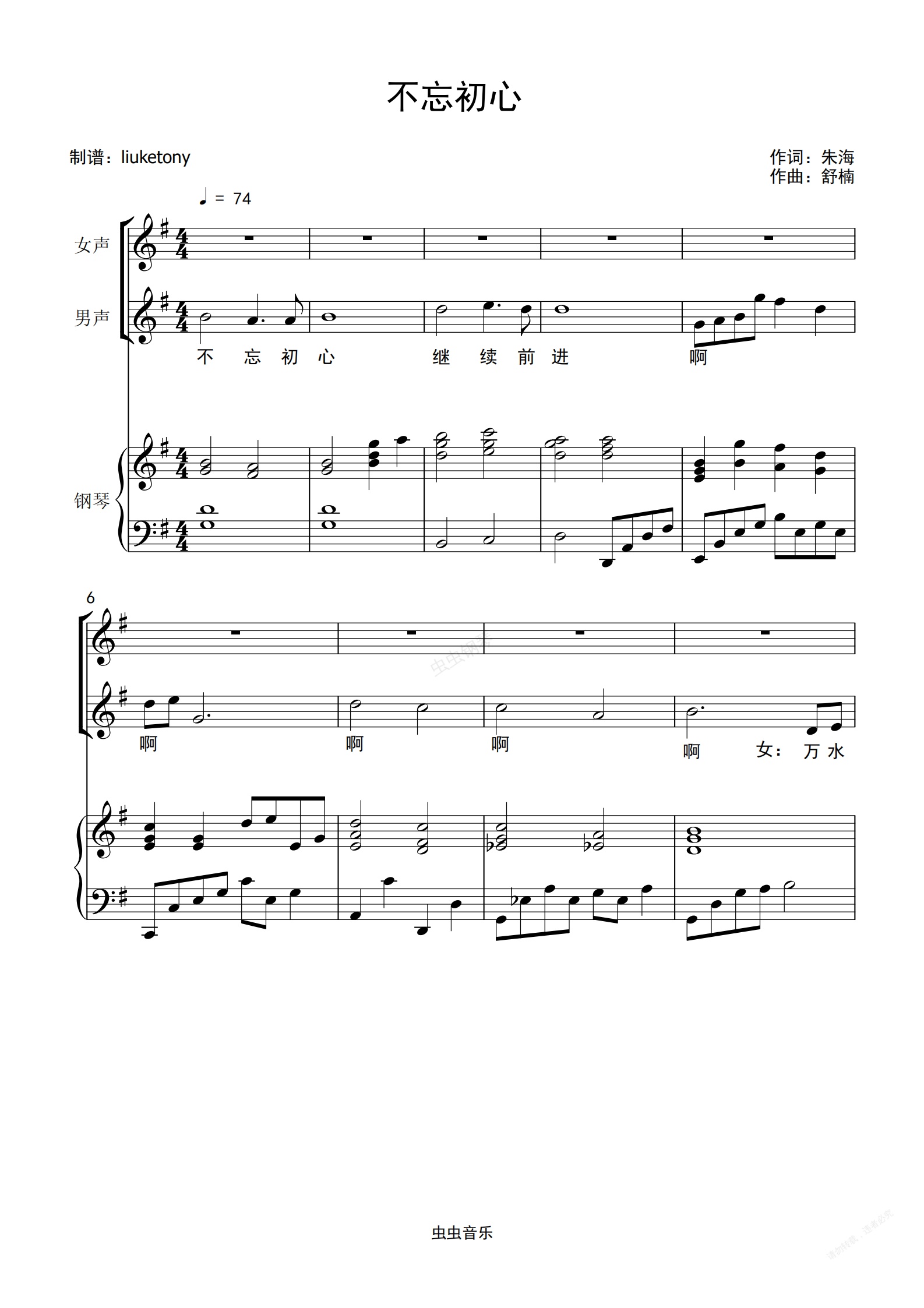 钢琴谱:不忘初心 - 韩磊 谭维维 钢琴伴奏谱 原调
