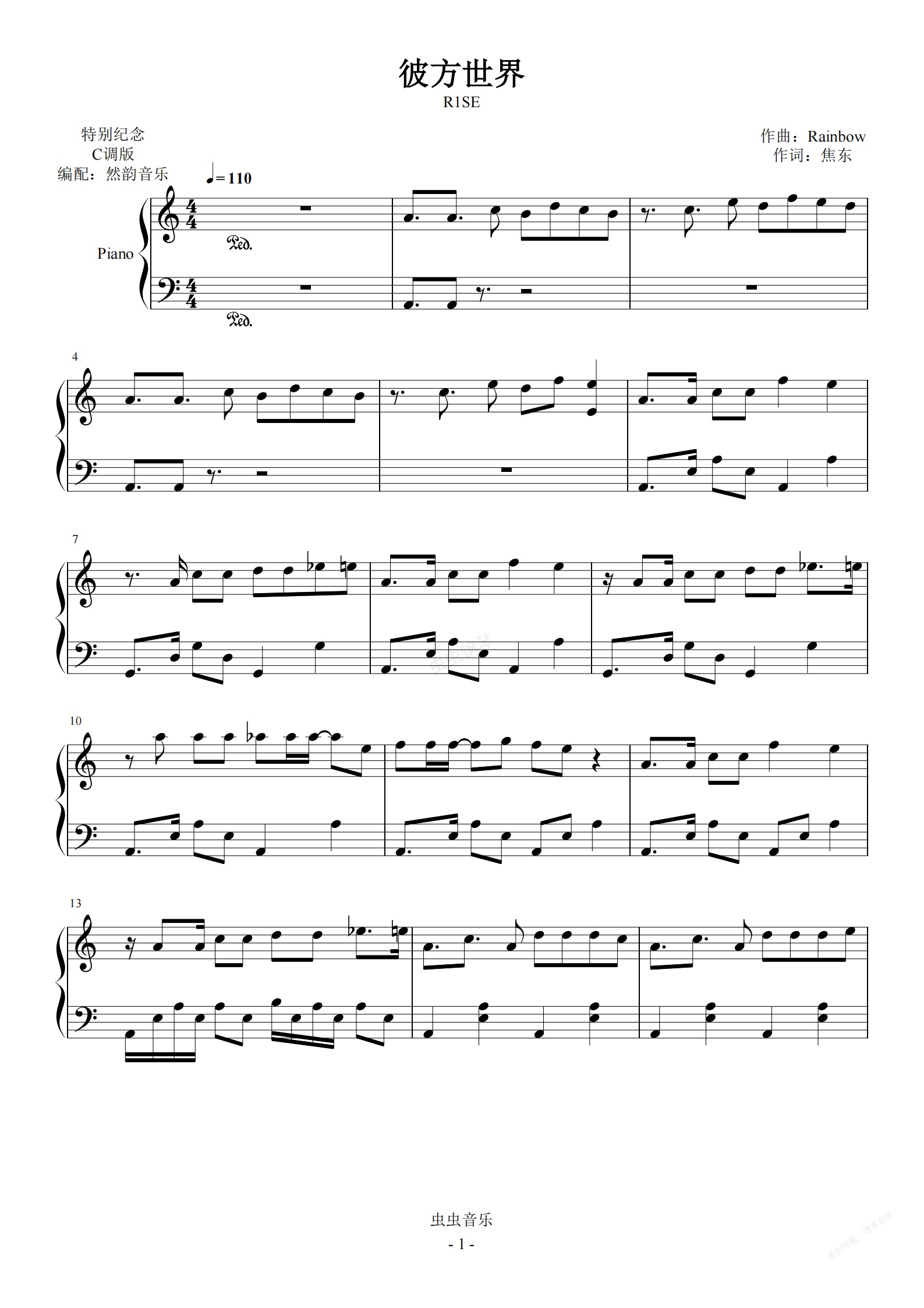 钢琴谱:【C调】R1SE-彼方世界 钢琴完美还原