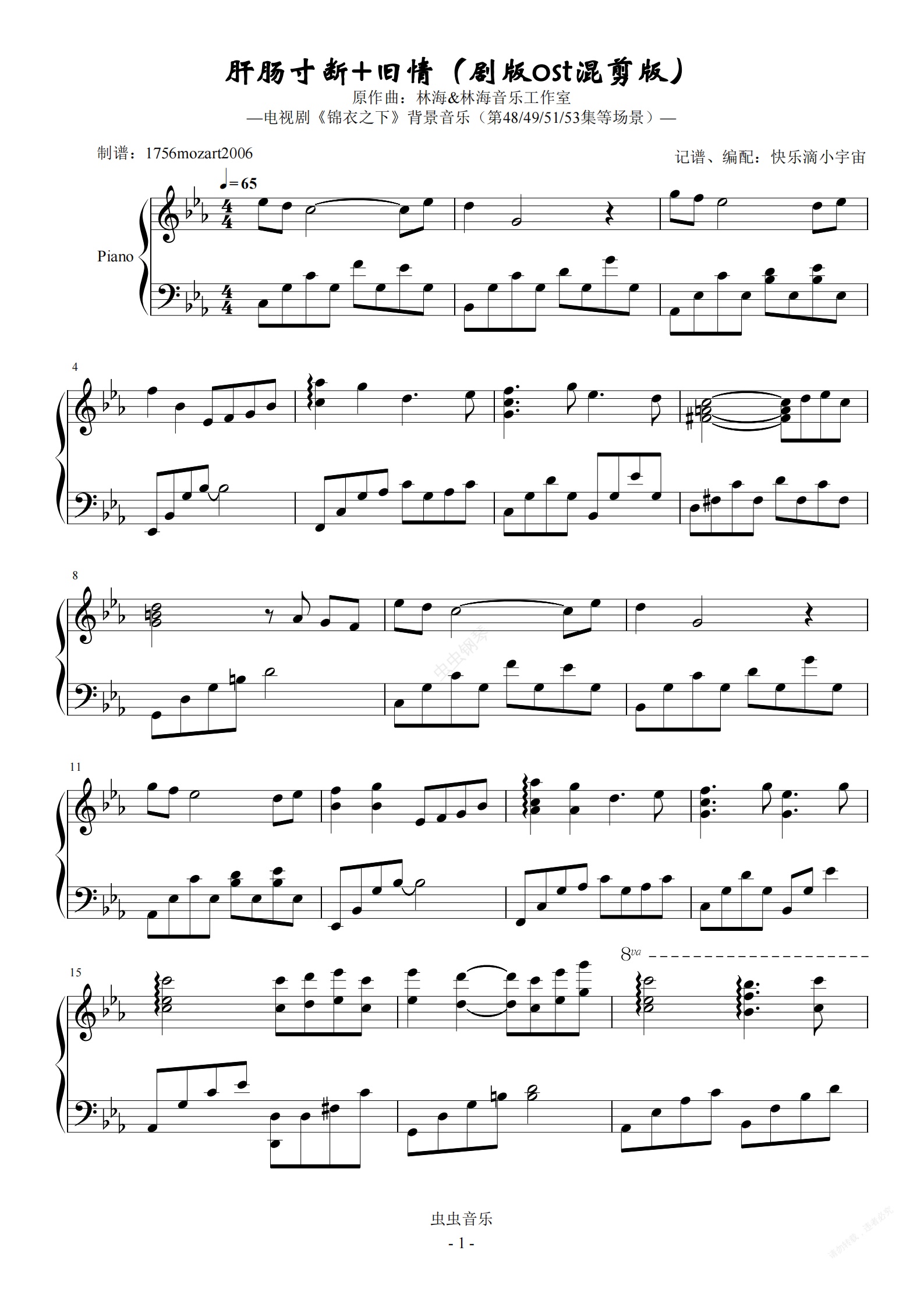 《肝肠寸断》钢琴独奏及主题变奏。这几段在剧里出现多次,但是实体专里只收录了一个《肝肠寸断》的弦乐版。陆绎被袁大娘在单位门口问话,bgm是《红颜旧》第二主题的三拍子变奏。岑港战后,陆绎搀着谢霄在树林里奋力返回,也是这段。我把几段整合在一起了,尾声混搭了《旧情》。希望大家喜欢!《肝肠寸断》主题就到33小节,亲们只演奏到这里过过瘾也是可以的,哈哈!
