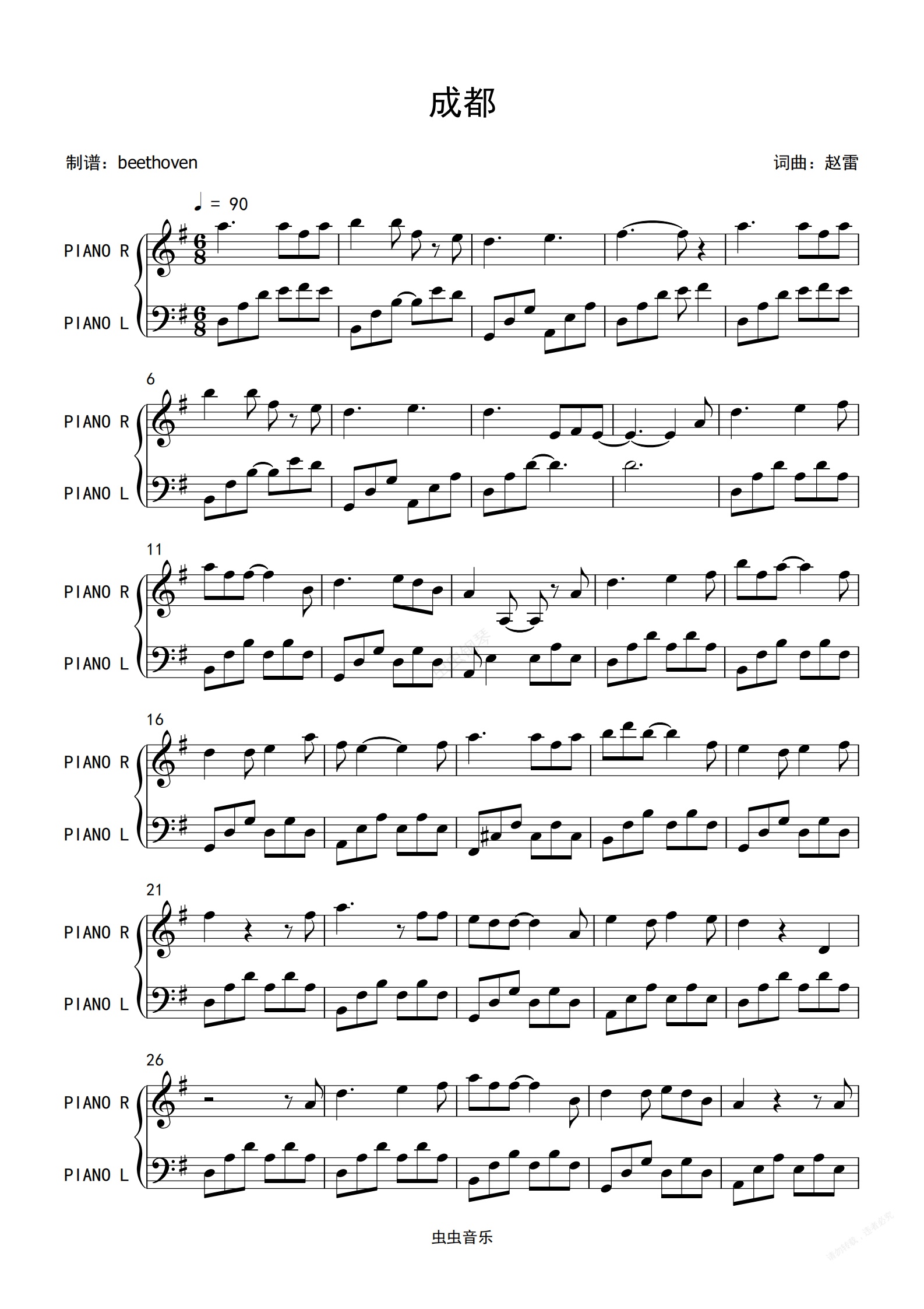 钢琴谱:成都-赵雷-钢琴独奏