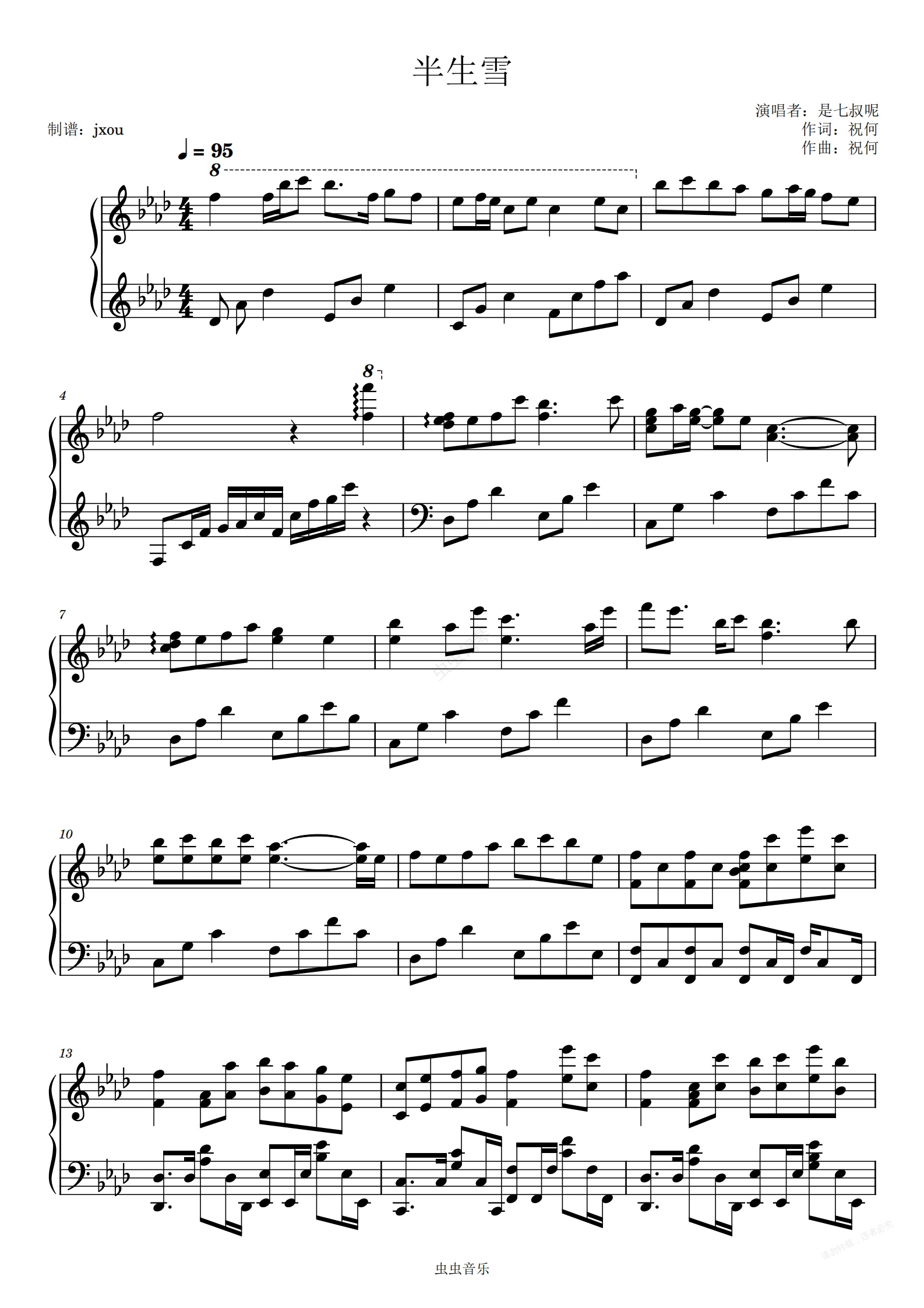钢琴谱:半生雪 原调高燃还原版