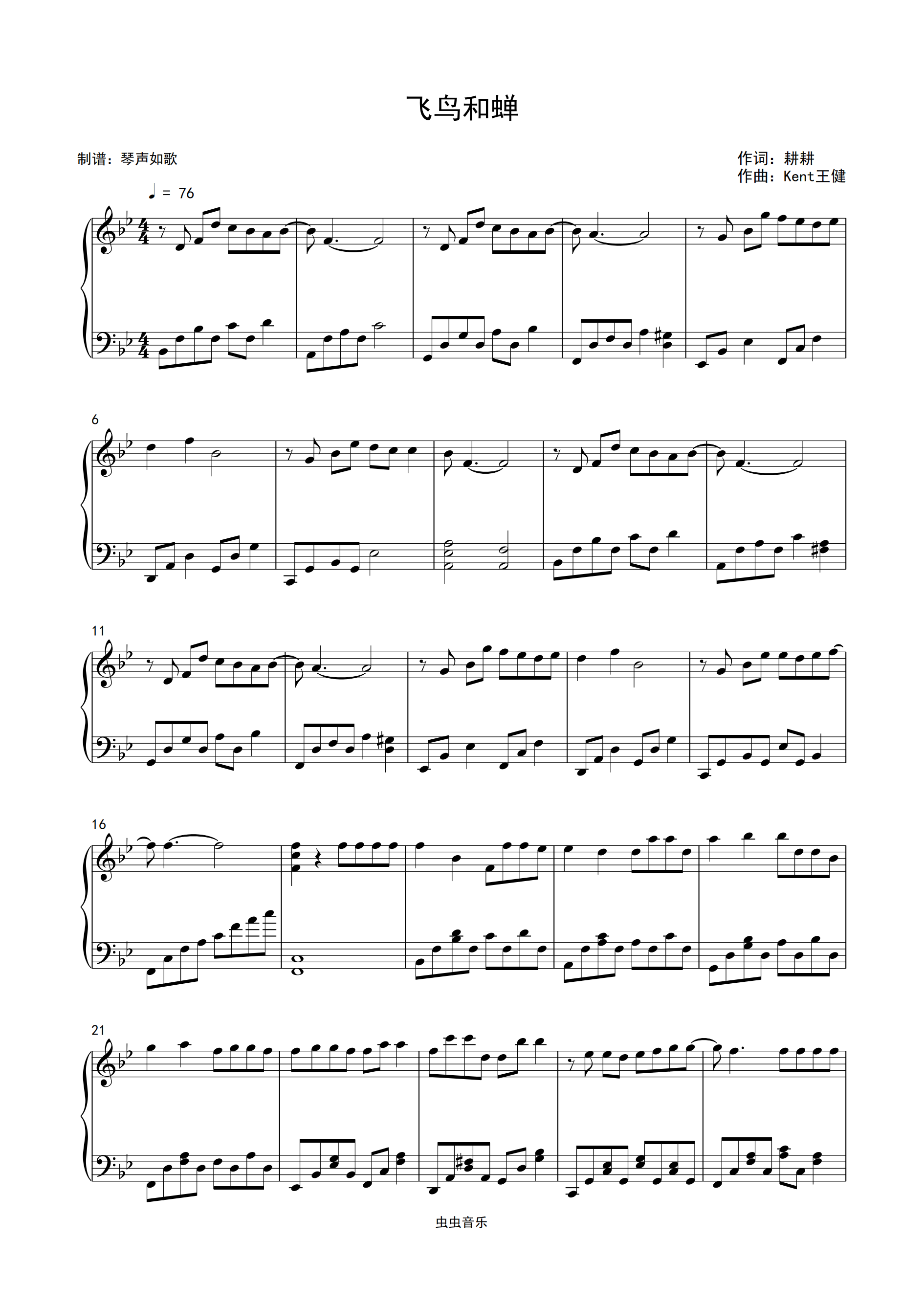 钢琴谱:飞鸟和蝉-任然 简单好听钢琴独奏