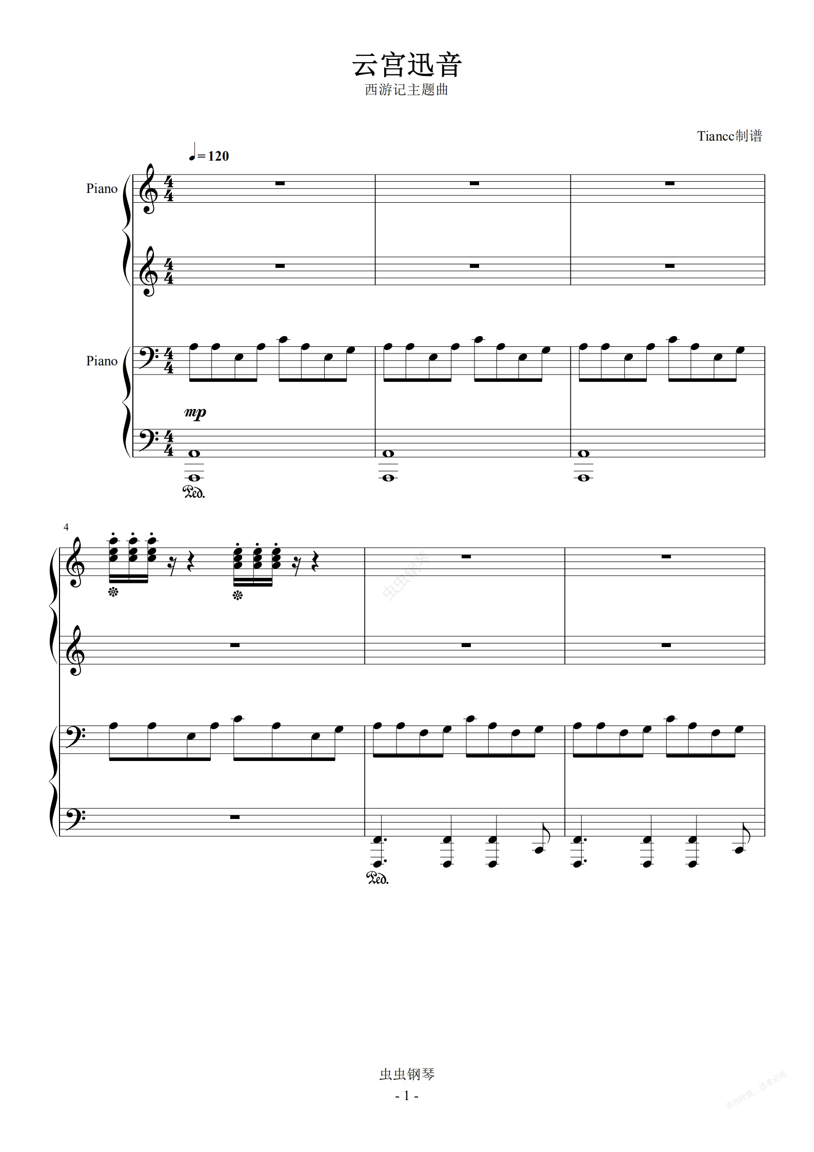 钢琴谱:《云宫迅音》四手联弹,两个人弹容易多了~599+难度