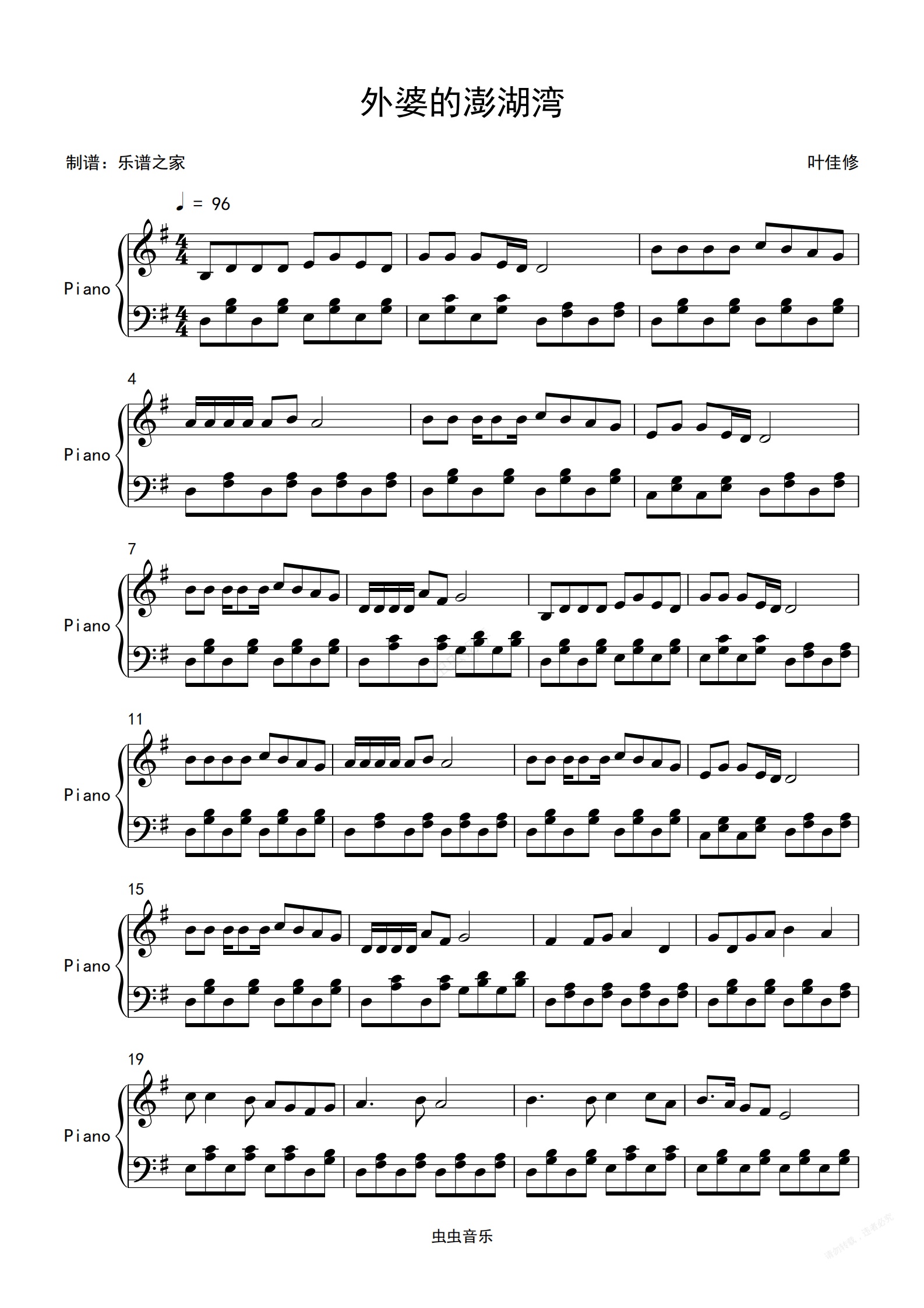 钢琴谱:外婆的澎湖湾 叶佳修 钢琴谱 独奏 高清 送示范音频