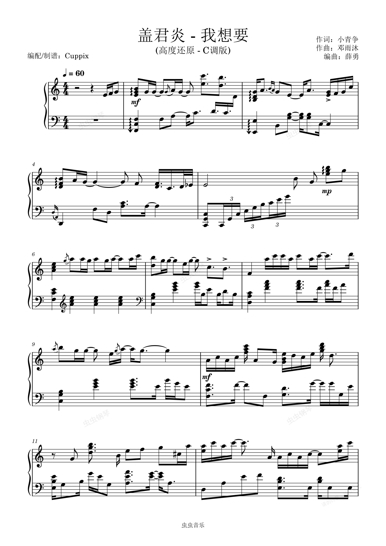 钢琴谱:盖君炎《我想要》Cuppix编配-高度还原-C调版