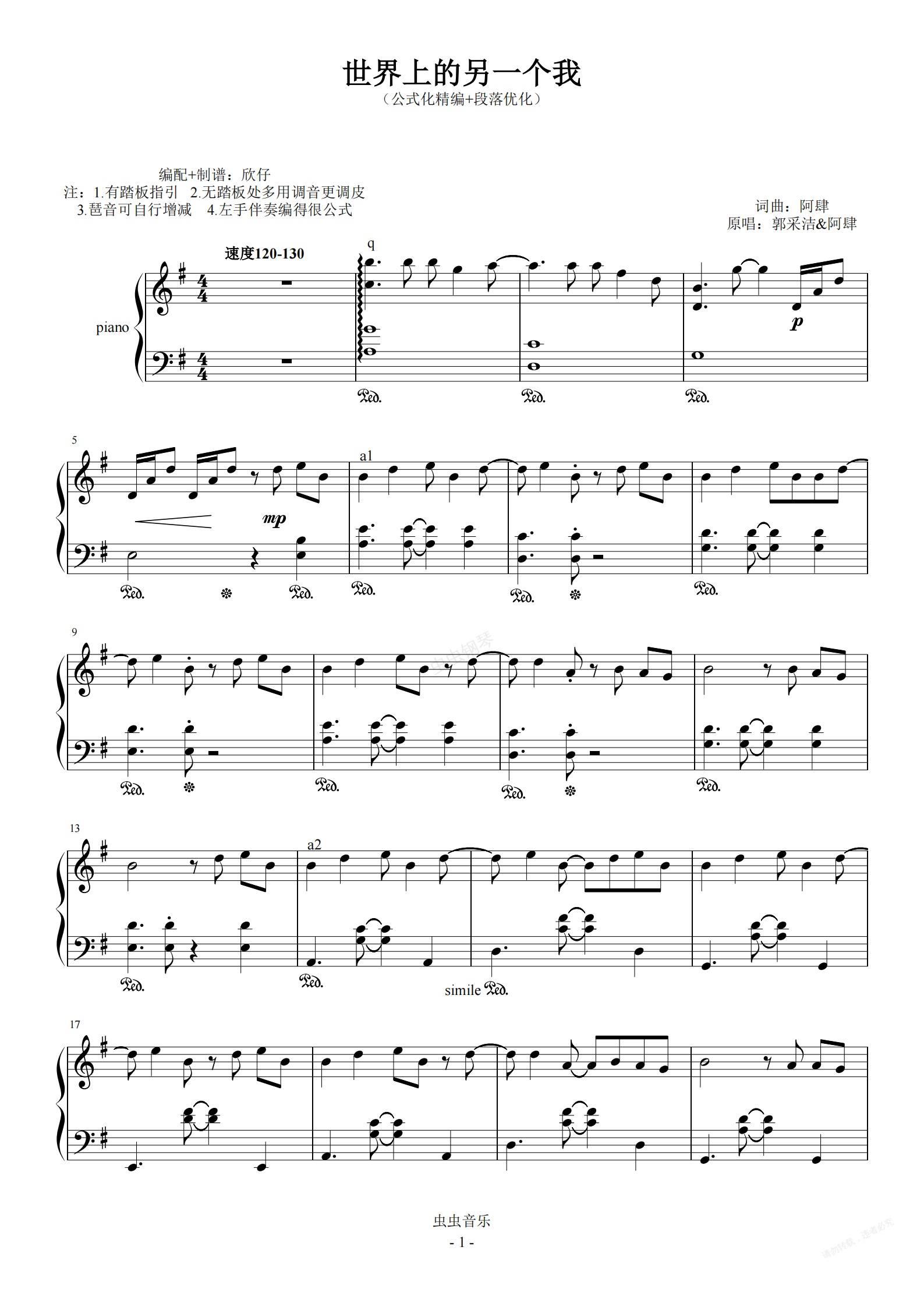 钢琴谱:阿肆&郭采洁G-《世界上的另一个我》(公式化精编跳跳版+段落优化)