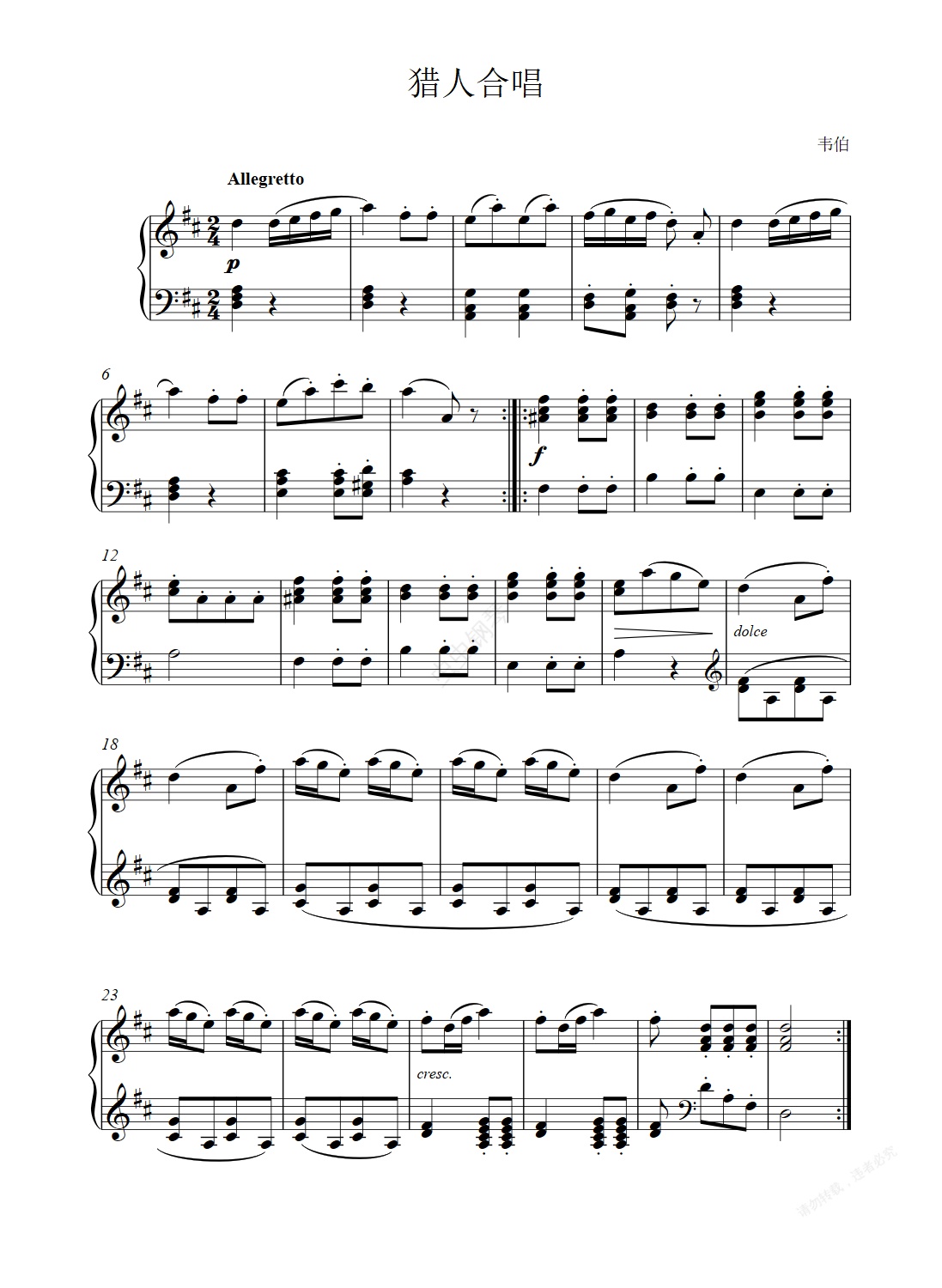 钢琴谱:猎人的合唱(选自歌剧《自由射手》)