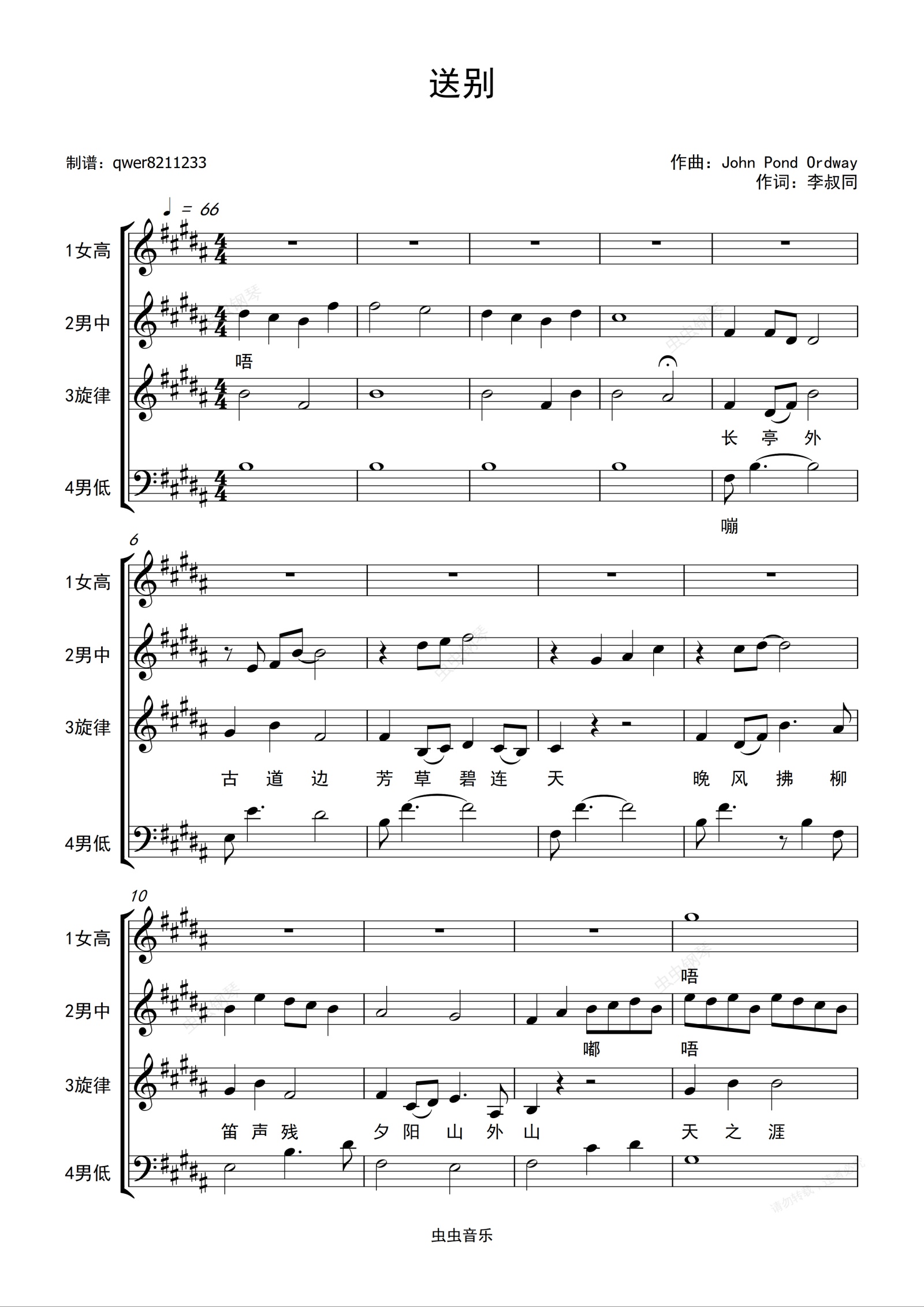 钢琴谱:送别(合唱)