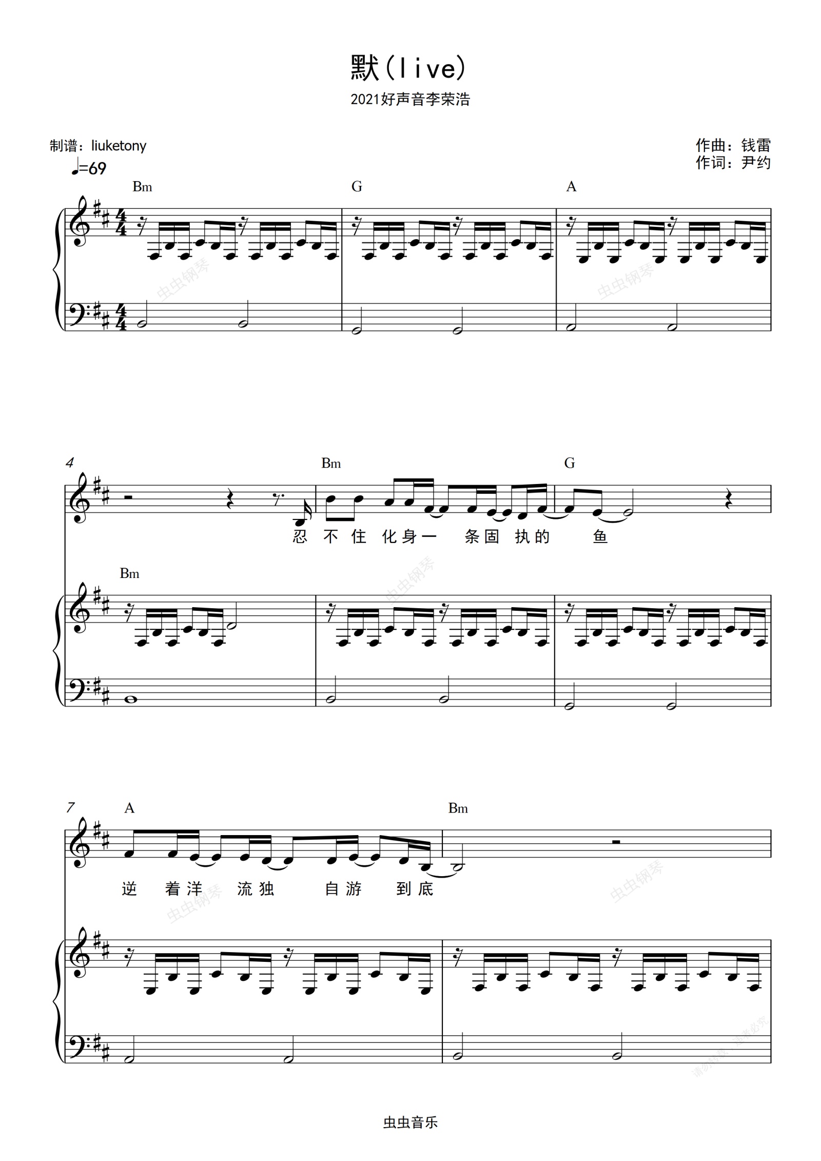 钢琴谱:默(live)2021好声音李荣浩 周杰伦
