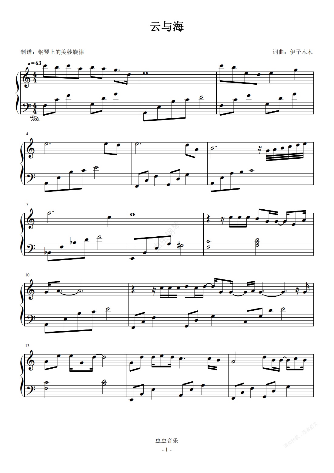 钢琴谱:云与海 C调简易版 阿YueYue