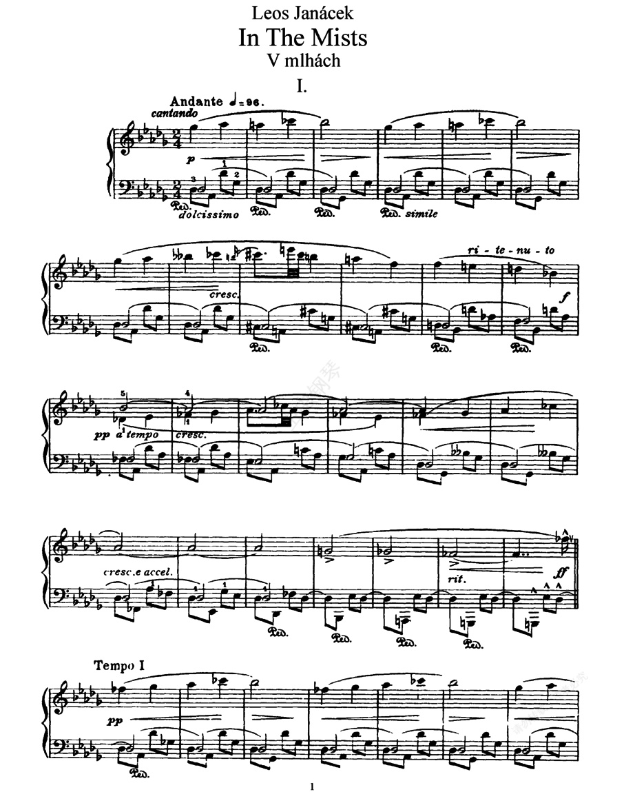 在雾中 In the Mist《在雾中》In the Mist ,作于1912年,由四首作品组成。它们都是非常古典的调性作品。除了调色上的偏冷,在主题发展上倒是有贝多芬晚期钢琴奏鸣曲的影子(虽然对亚那切克来说,贝多芬是看不上眼的人)。而且更加强烈的感觉是他在作品中对民族音乐的应用而使得作品有鲜明的地域特色。这大概也是他和渐德奥化的德沃夏克的区别,或许也是他未能成及早博得名声的原因之一。不过在对民族音乐的处理上,巴托克显然走得更远,扎得更深而非仅是对原始材料的稍加处理。1. 行板,降D大调,2/4拍。2. 很慢的柔板 Molto,降D大调,2/8拍。3. 行板,降G大调,4/8拍。4. 急板,降D大调,5/4拍。