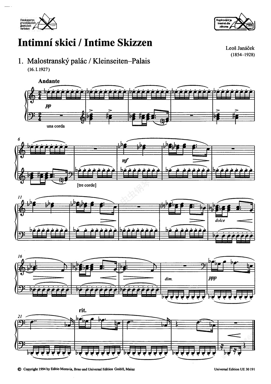 挚爱的素描《挚爱的素描》 ,又称“钢琴小曲集” ,其中收入了亚雅切克生前于不同年份所作的十三首钢琴小品,于1994年出版:1. 克莱恩塞坦宫殿 palác () ,作于1927年1月16日,2/4拍,行板。2. 无题 Bez názvu (Ohne Titel) ,创作年份不详,D大调。3. 旋律 ,曾于1923年出版,8/4拍,有节制的速度。4. 中板 ,曾于1911年出版,G大调,2/4拍。5. 听天由命 Jen slepy osud? (Nur) ,作于1927年12月11日,6/4拍。6. 消逝的过去 Aby uz se jíti nikdy zpet (Damit man nie zurück) ,作于1928年2月12日,2/4拍,行板。7. 金戒指 Zlaty (Der Ring) ,作于1928年8月7日(或8日),3/4拍。8. 我等着你 Cekám Te! (Ich Dich!) ,作于1928年8月,A大调,3/4拍,温柔的。9. 回旋曲 Rondo ,作于1877年7月,g小调,4/4拍。10. 记忆 Na památku () ,曾于1886年出版,降A大调,2/4拍,有节制的速度。11. 奥尔加 Své Olze ( Olga) ,作于1896年10月5日,G大调,2/4拍,中板。12. 摇篮曲 Ukolébavka ,曾于1920年出版,G大调,2/4拍。13. 我主基督诞生 se Pán ( ist Herr Jesus) ,作于1909年12月24日,G大调,4/4拍。
