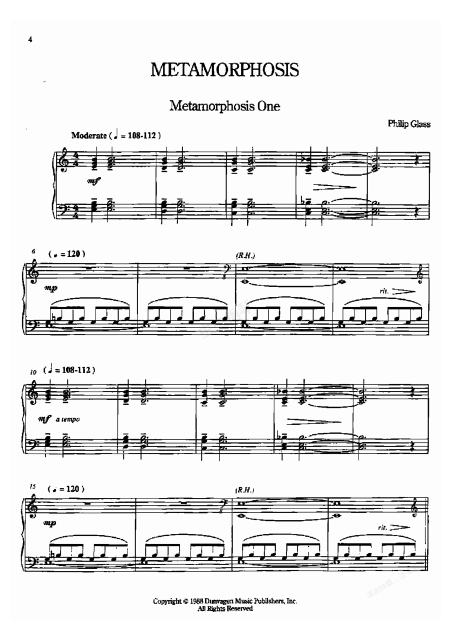 变形格拉斯发展出了新的音乐风格,相对于之前的机遇音乐艰深几近无调,新的音乐回归调性,并由数个单纯组合旋律一直重覆,产生出让人印象深刻的强烈力量感。这种新的风格正好填补了常久以来界于现代乐与前卫摇滚等音乐间的空隙。钢琴代表作《变形》 ,作于1988年,标题来源于根据卡夫卡的小故事写成的剧本,共由五首作品组成,技巧简单,易于弹奏。1. 中板,e小调,4/4拍。2. 流畅的,a小调,4/4拍。3. 中庸的快板,d小调,6/8拍。4. 流畅的,c小调,4/4拍。5. 中板,e小调,4/4拍。