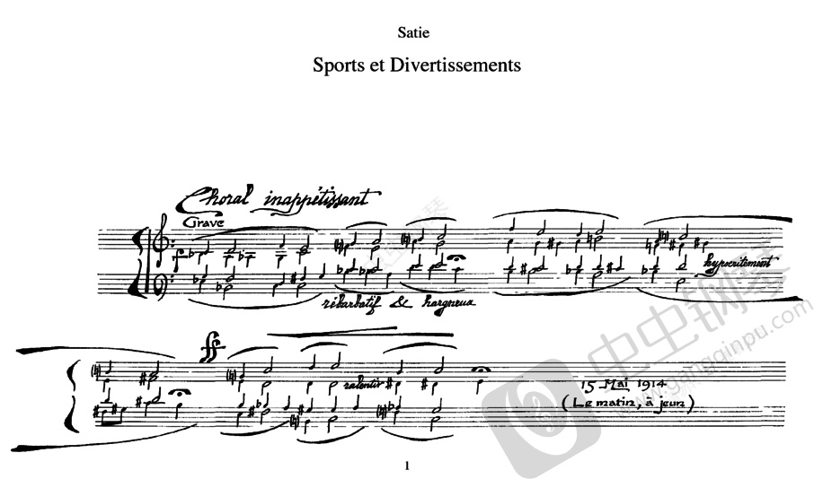 运动项目与嬉游曲 et萨蒂后期的作品有人评价说是沉溺于怪异的标题的文字游戏,音乐缺乏灵感。其实也不尽然,1914年的《运动项目与嬉游曲》 et 就是部颇有灵气的作品。这部作品是出版商为—组水彩画而向萨蒂约写的,开始时他竞嫌报酬过高而拒绝接受,直到后来降低了价钱才答应下来,不久他就交出了这套多达21首小曲的曲集。该曲集每首以—种运动项目或游戏名称作标题,如“秋千”、“赛跑”、“高尔夫”、“网球”、“垂钓”、“驾车”、“海浴”等,每首大都不超过一分钟,虽不是浪漫音画却也意像纷呈千姿百态,是套旋律优美,风格清新的标题音乐曲集。萨蒂的钢琴曲常态就是三五首小品为一组,一般每首篇幅长的两分多钟,短的只有几十秒,加起来也就是五六分钟,单首小品演奏时间超过3分、4分钟的都只有几首。他集聚小品最多的钢琴组曲也就是这部《运动项目与嬉游曲》分别表现从钓鱼、游泳到网球、高尔夫的各种运动。21首中篇幅最长的1分多钟,最短的15秒,也就是一种瞬间感觉。萨蒂的钢琴曲,用斯特拉文斯基的说法是,“一种有力、纯净,不带任何形象化装饰的语言”。他基本都是单纯音符的简略组织,在这组织中节奏感极好。他与德彪西所追求淤积的浓厚色彩正好相反,德彪西用加法,他用减法。
