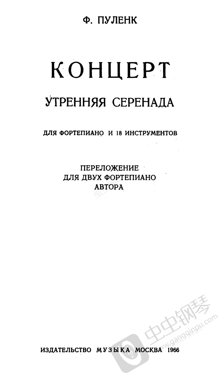 晨歌 - 为钢琴和18件管弦乐器而作1929年,诺艾勒伯爵夫妇委托普朗克写一部供家庭娱乐用的舞蹈音乐,根据其室内演出的特点,普朗克写成了由独舞者表演,小型乐队(钢琴和18件管弦乐器)演奏的舞蹈协奏曲《晨歌》 。同年6月18日在伯爵府邸非公开初演,1930年1月21日由薇拉·南希诺娃的俄罗斯舞剧团编成舞剧正式上演。故事情节很简单:森林狩猎女神狄安娜渴望爱情,而神却命她终身纯洁,朋友们陪伴着她,把神赐予的弓箭交给她。狄安娜接过弓箭奔入森林,以打猎来消除苦恼。乐曲由八个部分构成:1. 托卡塔 ,沉重的快板。小号和圆号奏出庄重的旋律,钢琴与之呼应。在乐队音型的衬托下,钢琴以颤音引入节奏活跃的音乐。然后,全部让位给钢琴的炫技。2. 喧叙调 Ré ,小广板,“狄安娜的朋友们”。乐队和钢琴的音响组合在一起,形成强烈有力的和弦进行。中间段落突出单簧管轻柔的旋律。简短的再现后,音乐直接进入第三部分。3. 回旋曲 ,快板,“狄安娜和她的朋友们”。这是全曲中最优美典雅的一段。节奏轻盈,旋律动人,以调性变化加强色彩感,使人仿佛感受到田园的清新,听到牧笛的吹奏和纯朴的民间歌舞声。4. 急板 ,“狄安娜的梳妆”。音乐充满活力,旋律在各乐器上展现,始终保持生气勃勃的活跃气氛。5. 喧叙调 Ré ,小广板,“狄安娜变奏曲的引子”。乐队和钢琴不论是纵的音程关系还是横的旋律进行均以增二度、三全音,大、小七度的不协和音关系为主,同时结合附点节奏及强与弱的力度对比,造成不稳定感,为后曲作准备。6. 稍快的行板 ,“狄安娜的变奏曲”。钢琴均匀的节奏衬托乐队优美的旋律,显示出古典风格的优美典雅。中段变得激烈冲动。再现时旋律移到钢琴,返回安静的气氛。7. 粗犷的快板 féroce ,“狄安娜绝望”。贯穿钢琴和乐队交替出现的强烈的三连音进行及不协和音响是过渡性段落。8. 尾声 ,柔板,“狄安娜的告别与出走”。钢琴沉重的和弦与乐队柔和的音色相呼应。然后主要旋律吉中到乐队,不断在大提琴和低音大管、小提琴和小号之间轮流出现,作曲家指明表情记号“哀怨的”。最后音响渐弱,仿佛是狄安娜无可奈何地离去。