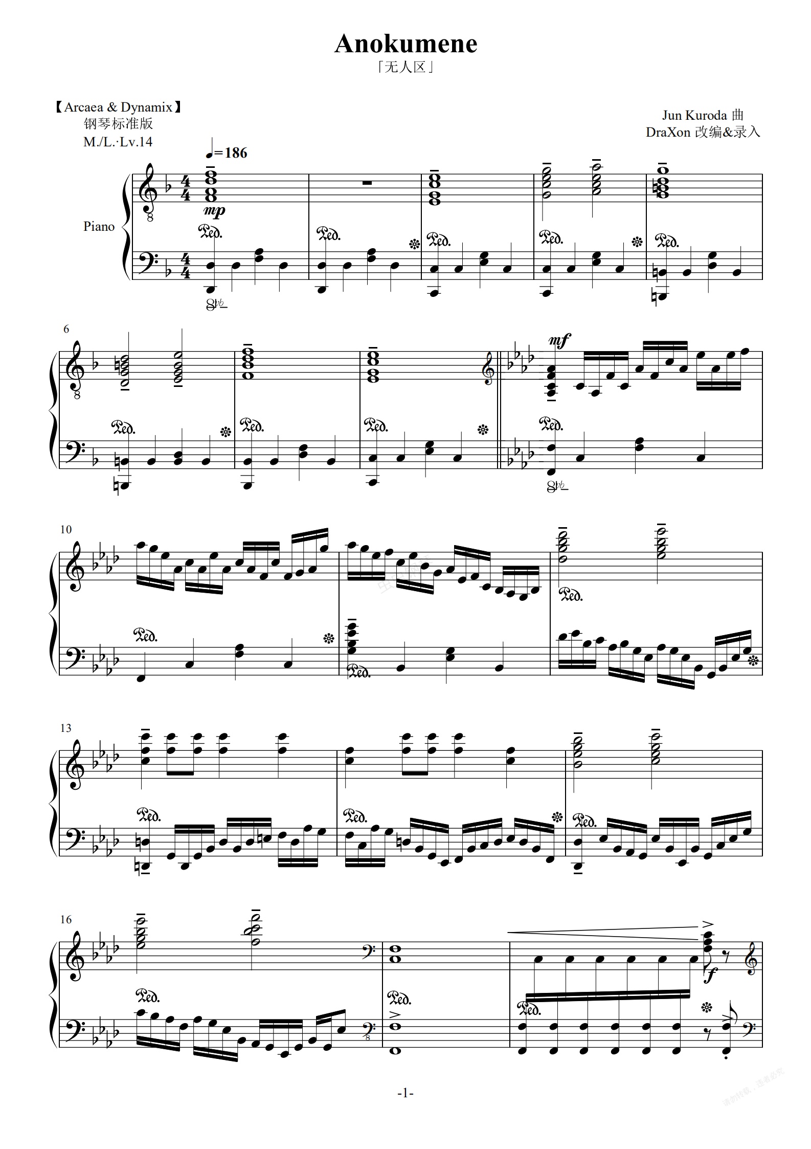 钢琴谱:Anökumene(无人区,by Jun Kuroda in Arcaea & Dynamix)