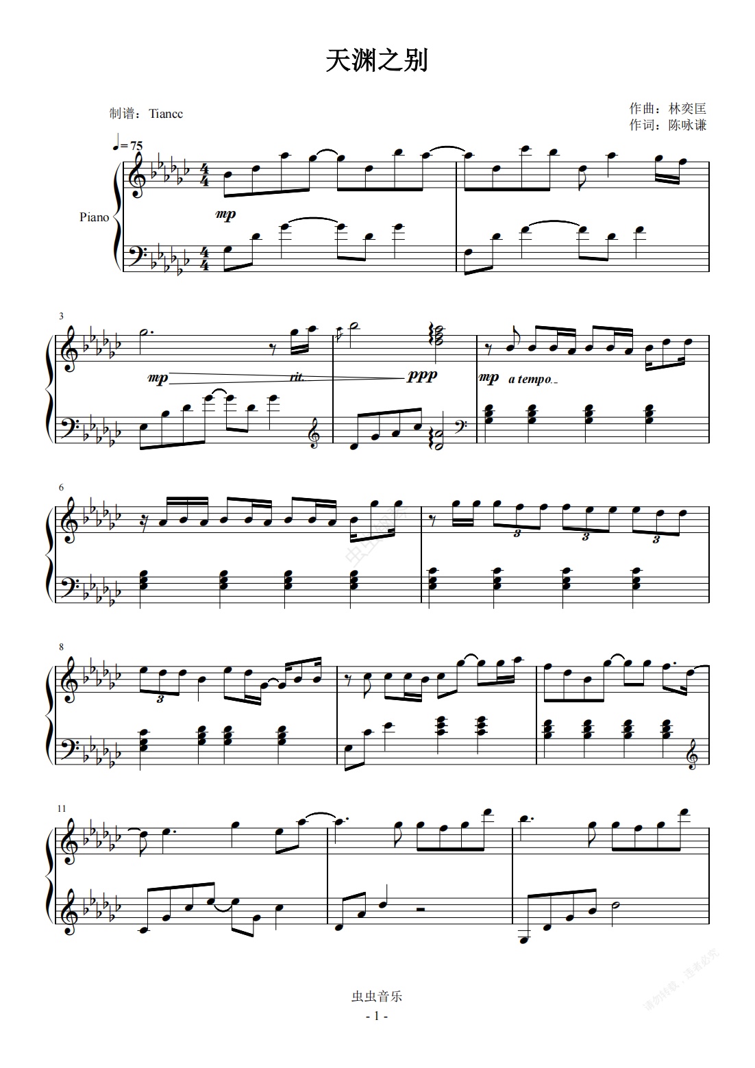 钢琴谱:《天渊之别》中国好声音,(原调)599难度