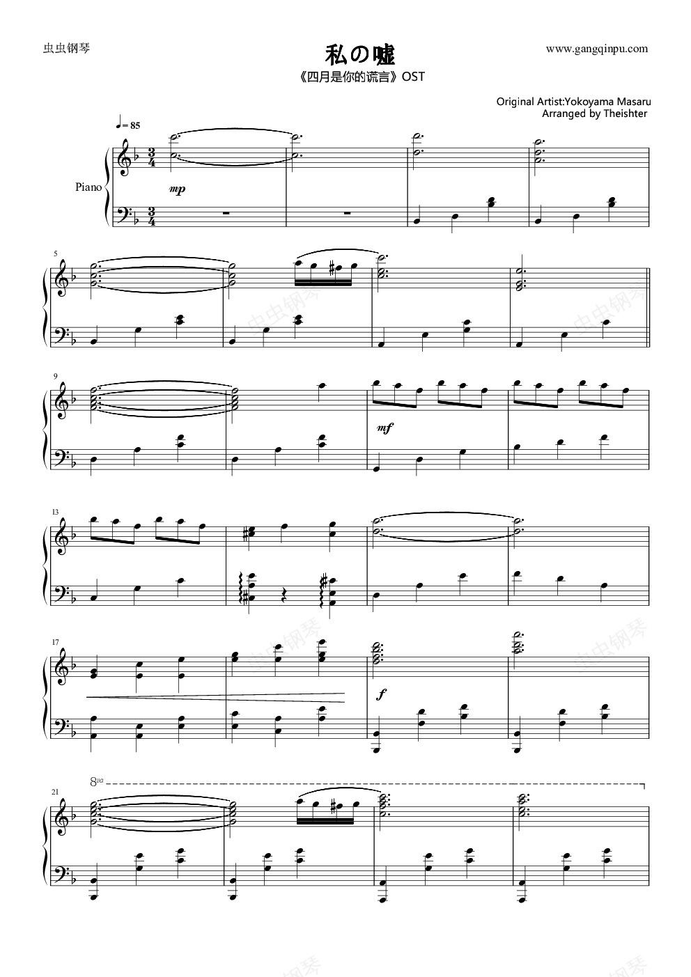 本周更新,《四月是你的谎言OST《私の嘘》F大调改编版,原版是C大调的。虫钢已经有谱子了,链接:/html/