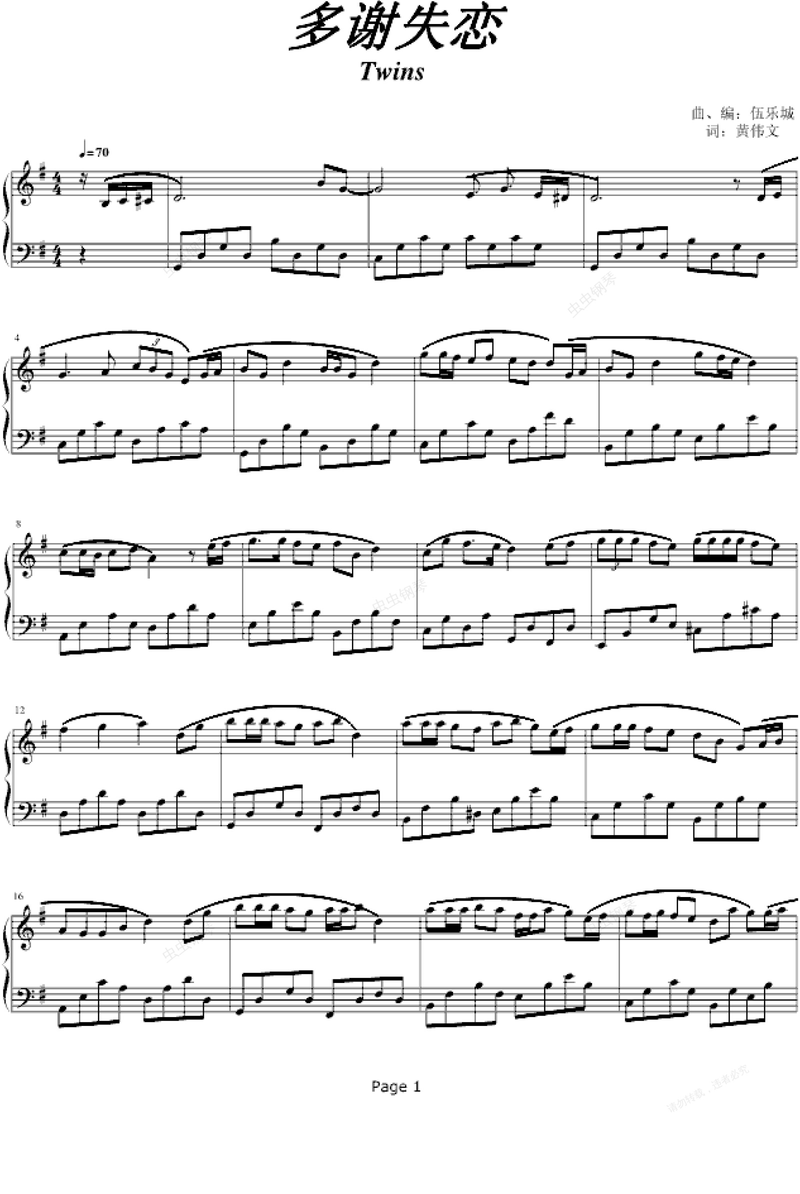 钢琴谱:多谢失恋