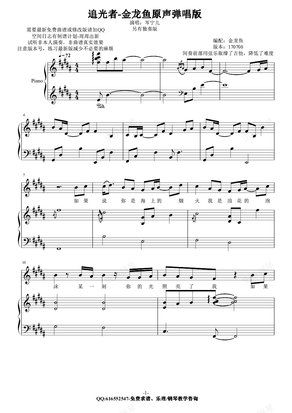 版本说明  特别声明:本人放出的所有钢琴谱均完整上传至曲谱分享网站,并定时更新,不以琴谱做任何牟利(除本人原创音乐以外)  编写曲谱和完整放出的目的是为了同广大琴友学习交流钢琴演奏、音乐理论等问题……  对此伴奏谱有:转调、简化、速成等需求的请加  免费扒谱编配请加QQ,人多需要排队,但不会收费  放出的伴奏谱中有本人弹奏时为了方便自己弹奏或者为达到更好个人弹奏效果而做改动,  具体求谱、写谱、谱面等问题的详细说明请参考QQ空间日志  放出为大家分享,金龙鱼所有曲谱(除原创)不用作商业用途,仅供大家弹奏时参考用,  固定每周出新  再次特别声明,本人放出只是为了交流学习,觉悟他求!从求谱到制谱发布中间没拿过一分钱,希望别有用心之人看清楚  。。。。。。以后的修改版都会在QQ放出版本修改的具体内容,欢迎大家查阅  设置版本号以及不停的改版给大家的练习带来烦恼,本人对此表示抱歉  但是,人都是在不停学习进步的,随着学习和实践的深入,我对我以前的谱子会有新的想法,以前谱中出现的错误得以在知识丰满后修正,这是对所有人的尊重,  希望大家谅解,这么做的目的也是源于本人放谱的目的:为了学习交流,为了促使自己的进步