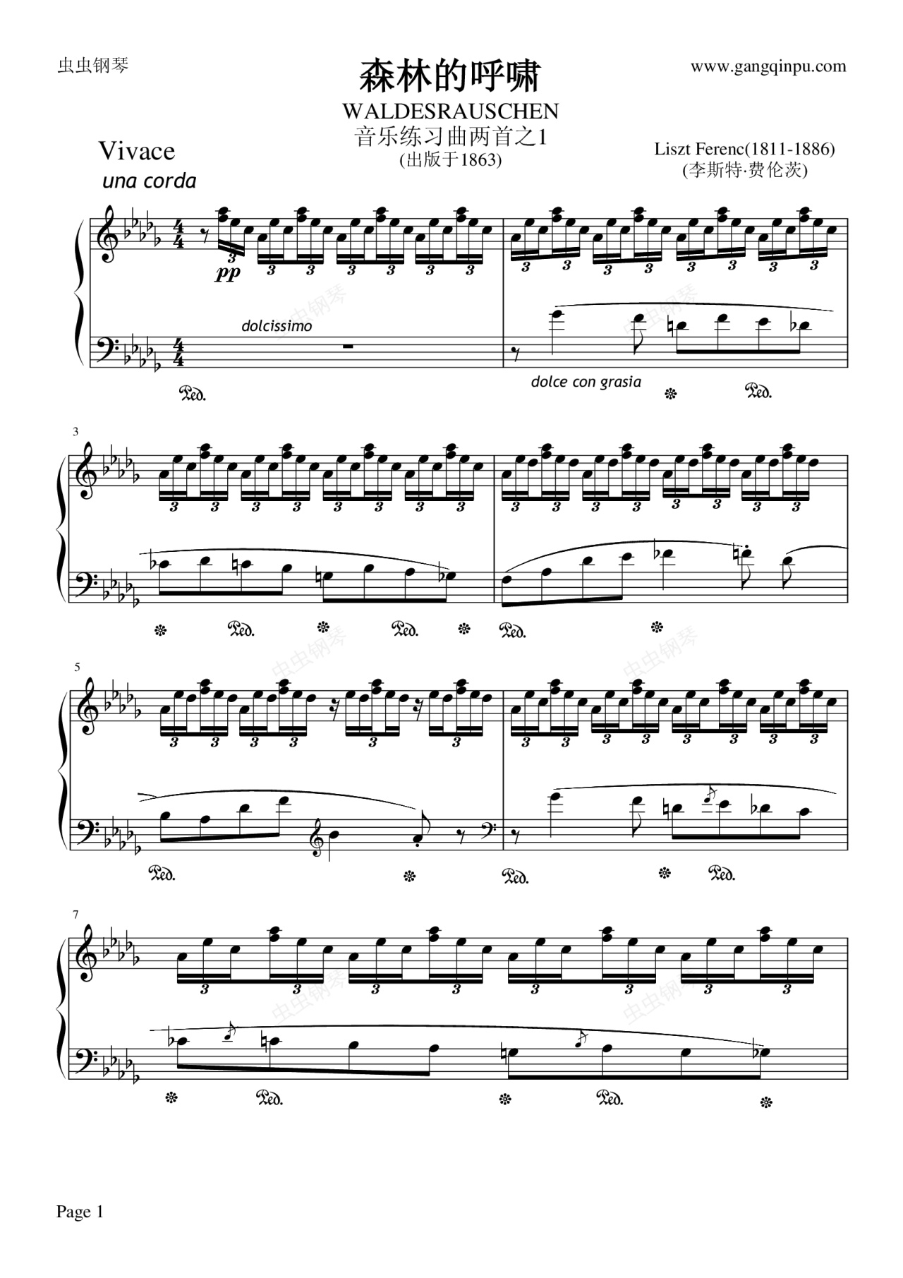 《森林的呼啸》是一首音乐会练习曲。从标题来看,主要是描写风吹过森林的动感及发出的声响。从技法上看,使用了快速音型,八度,双音等高难度技巧。因此必须要有高超的技术和丰富的表现力,才能弹出变化细腻流畅气息连贯悠长,音乐层次清晰的效果。