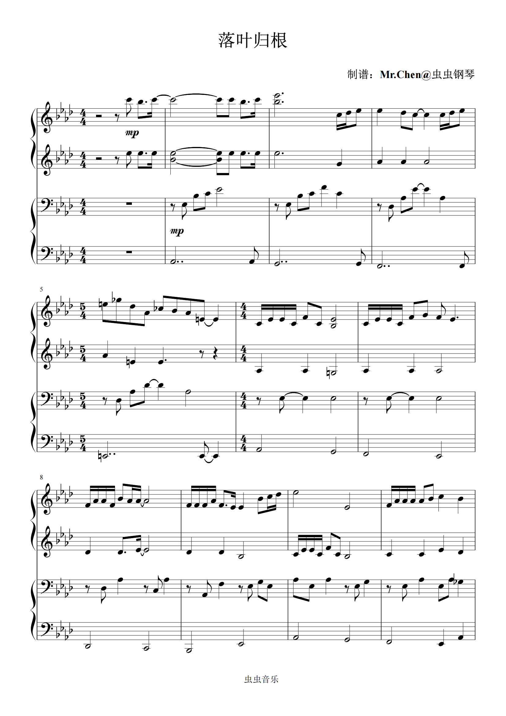 钢琴谱:落叶归根 (四手联弹)-王力宏