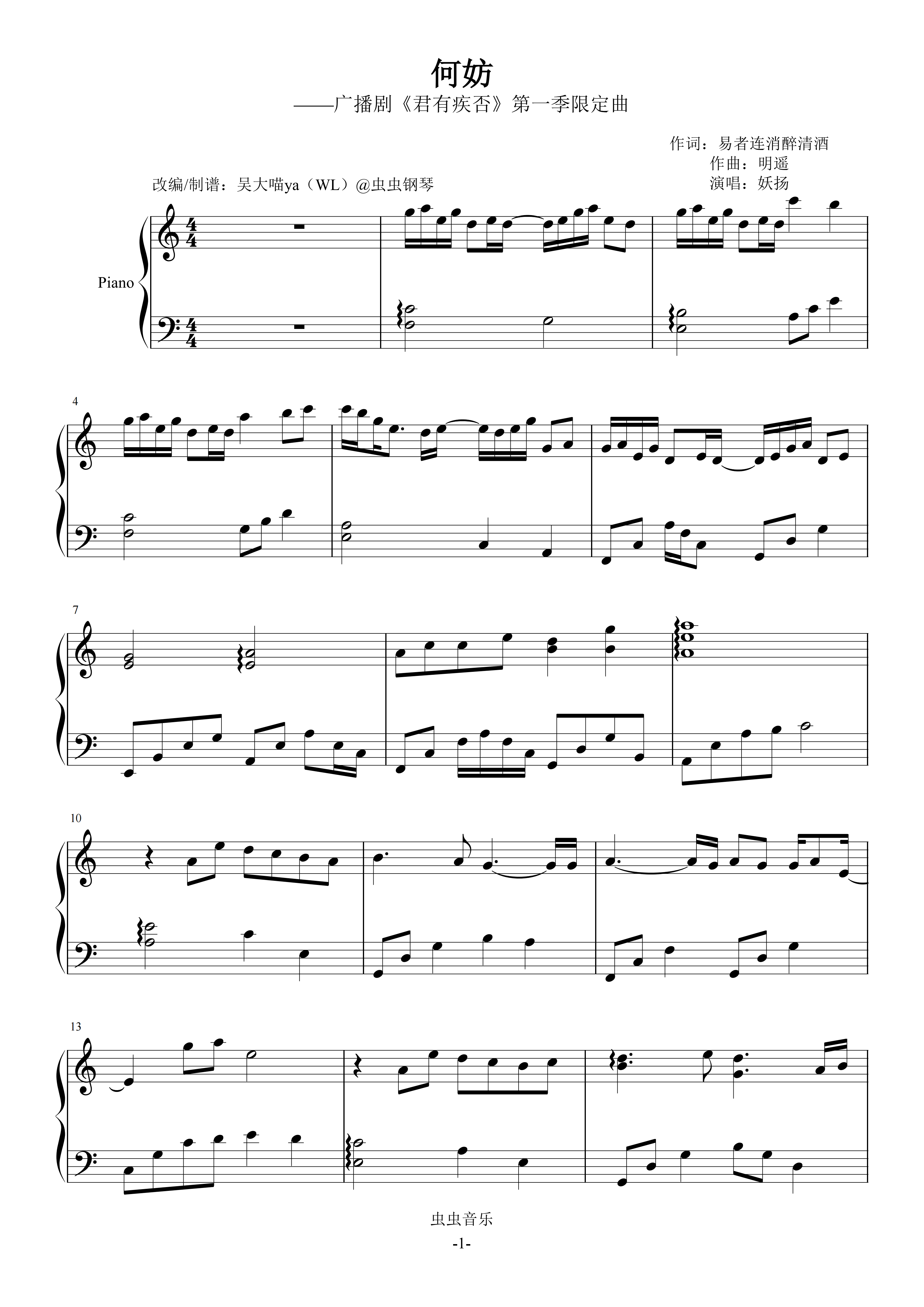 钢琴谱:何妨C调-广播剧《君有疾否》第一季限定曲