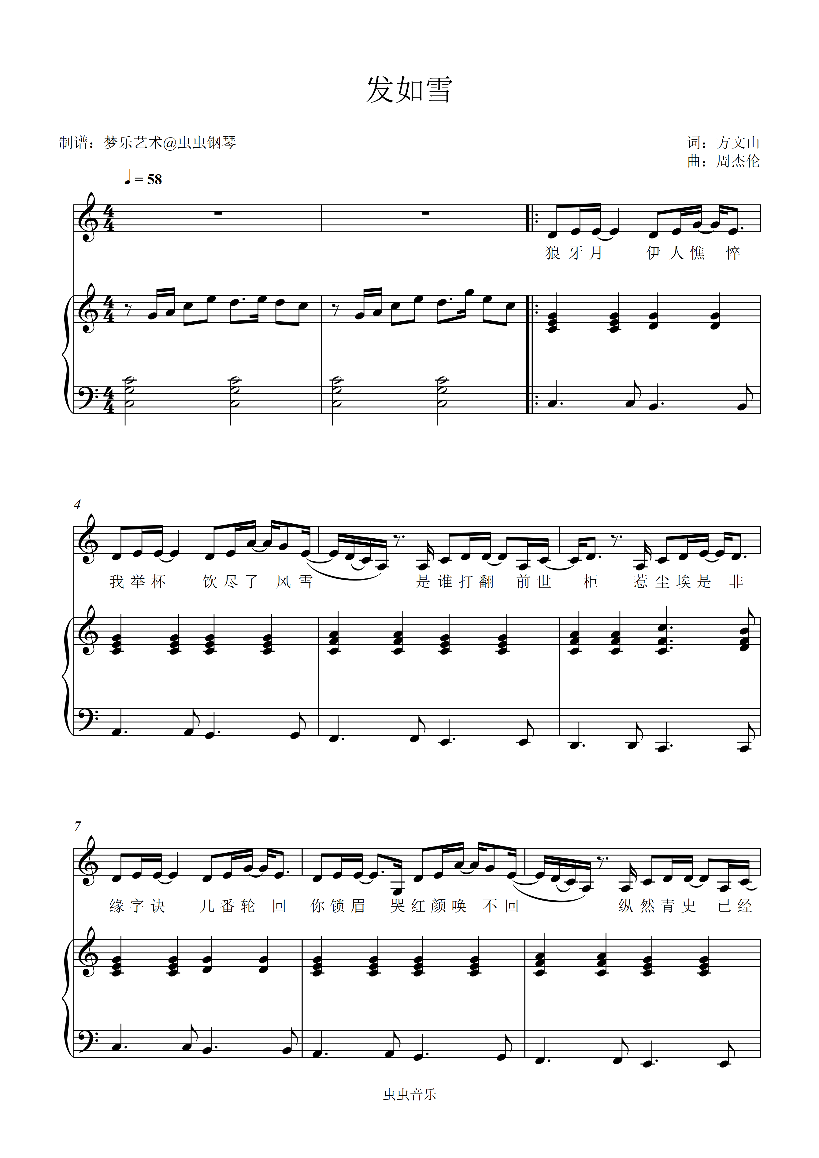 • 发如雪钢琴简谱 C调 数字双手 方文山