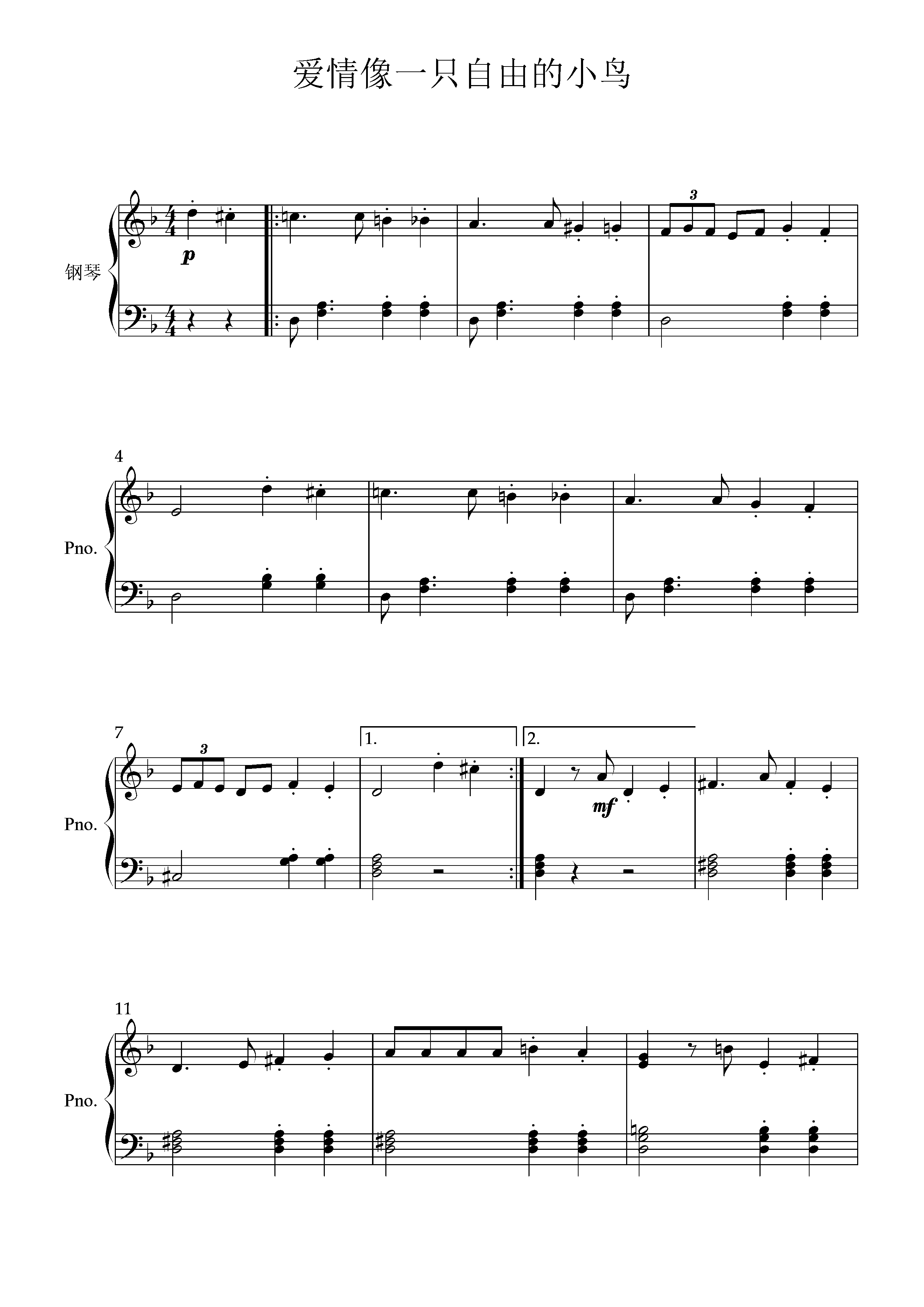 爱情像一只自由的小鸟钢琴简谱 数字双手