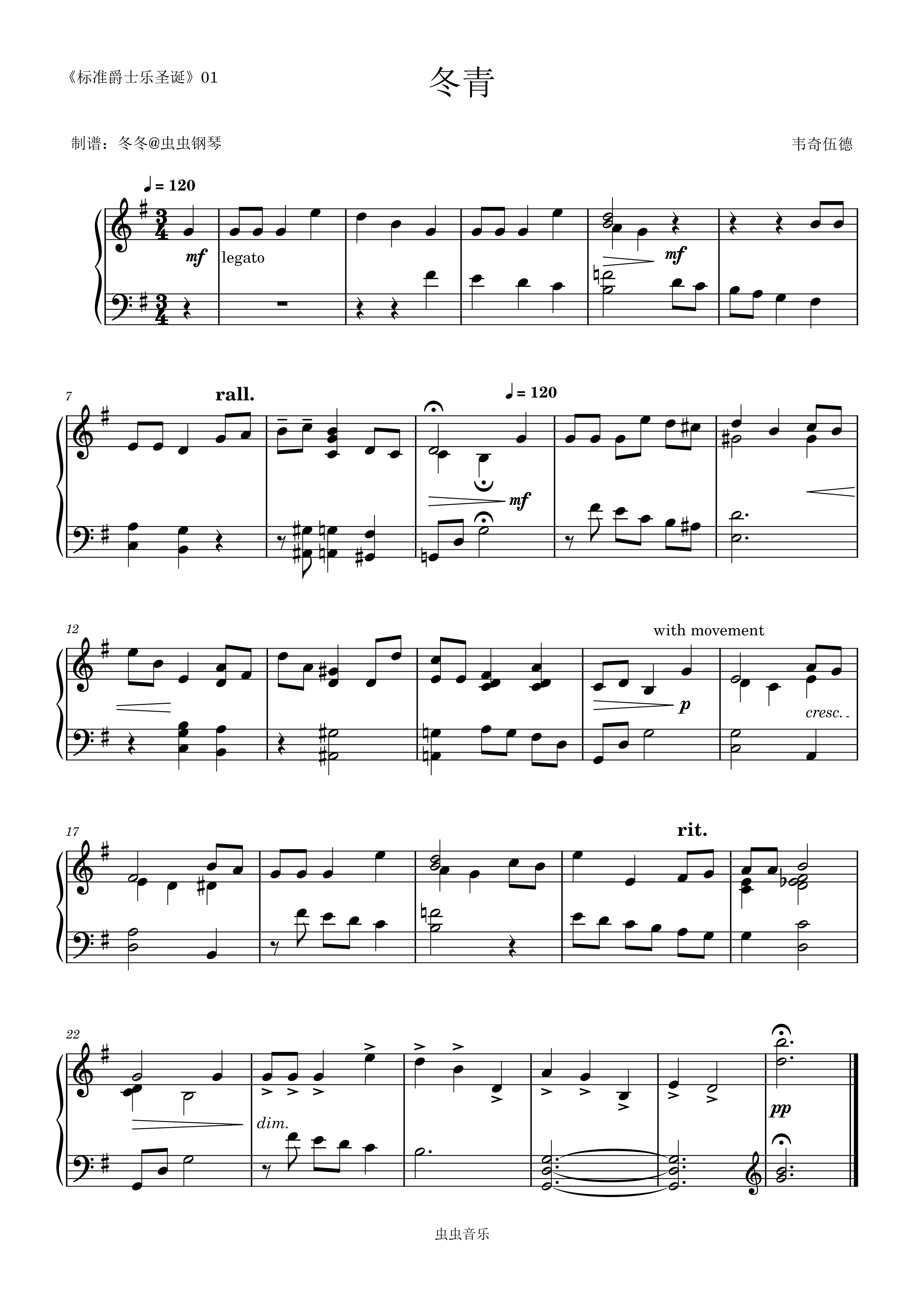 • 圣诞节的冬青花环钢琴简谱 E调 数字双手