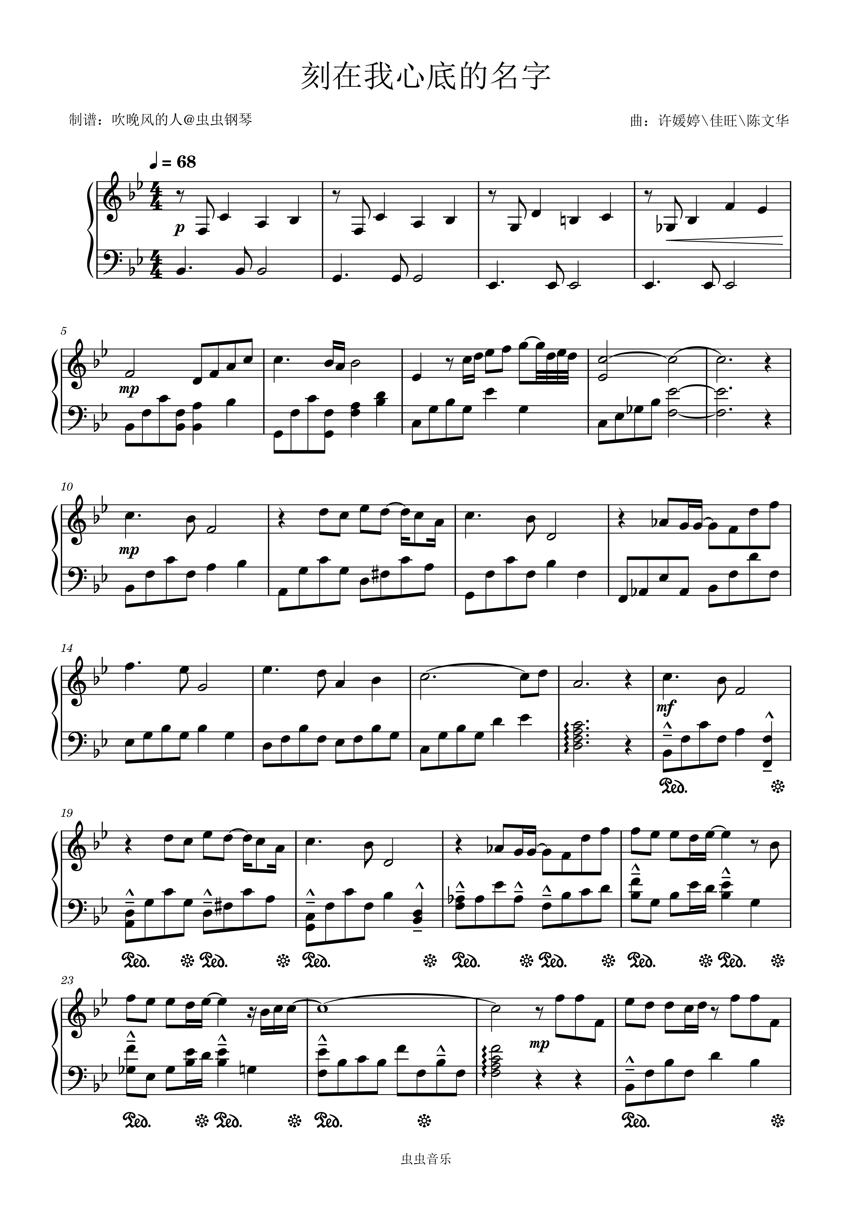 • 刻在我心底的名字钢琴简谱 Bb调 数字双手 许媛婷/佳旺/陈文华