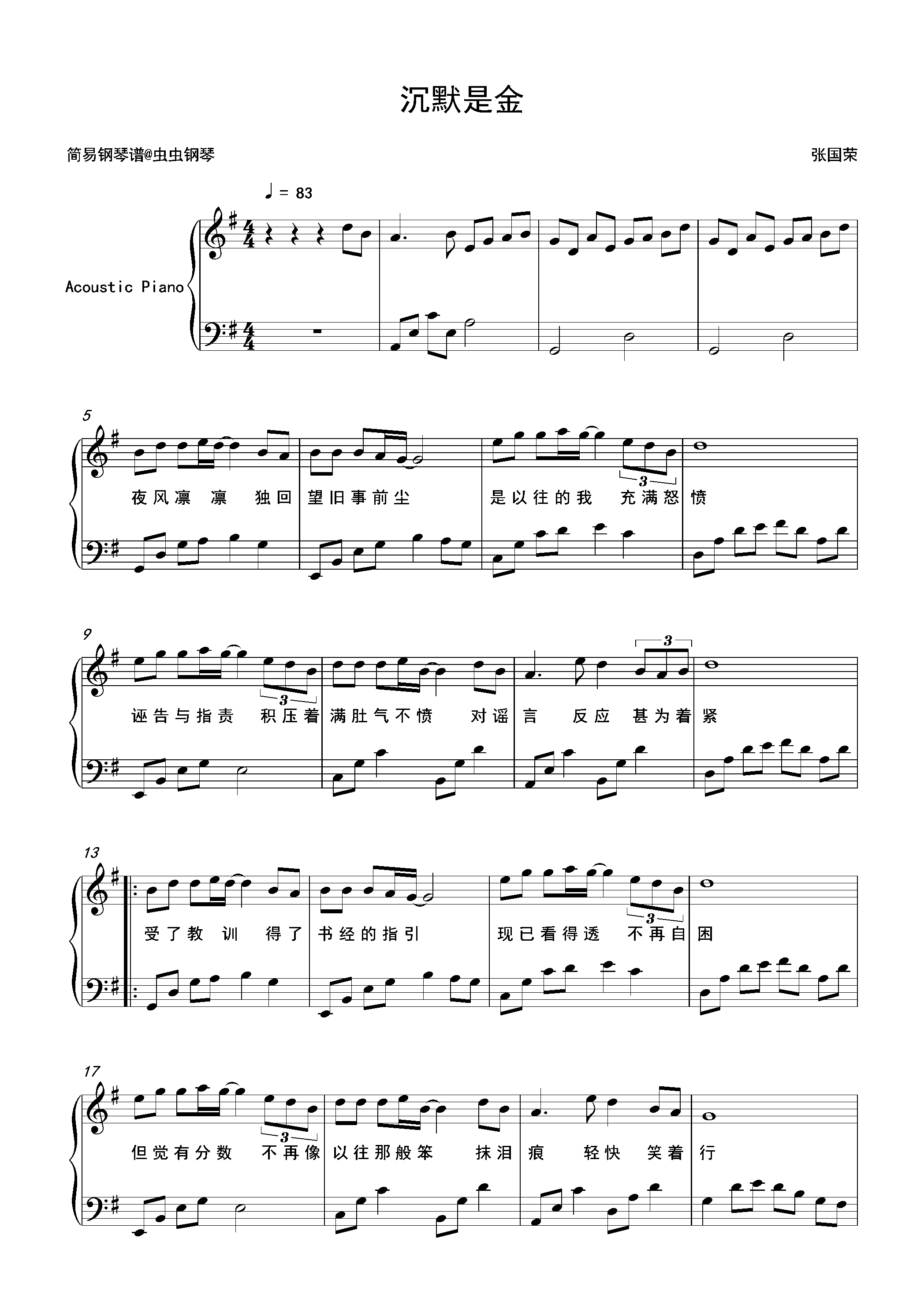 • 沉默是金钢琴简谱 C调 数字双手 许冠杰